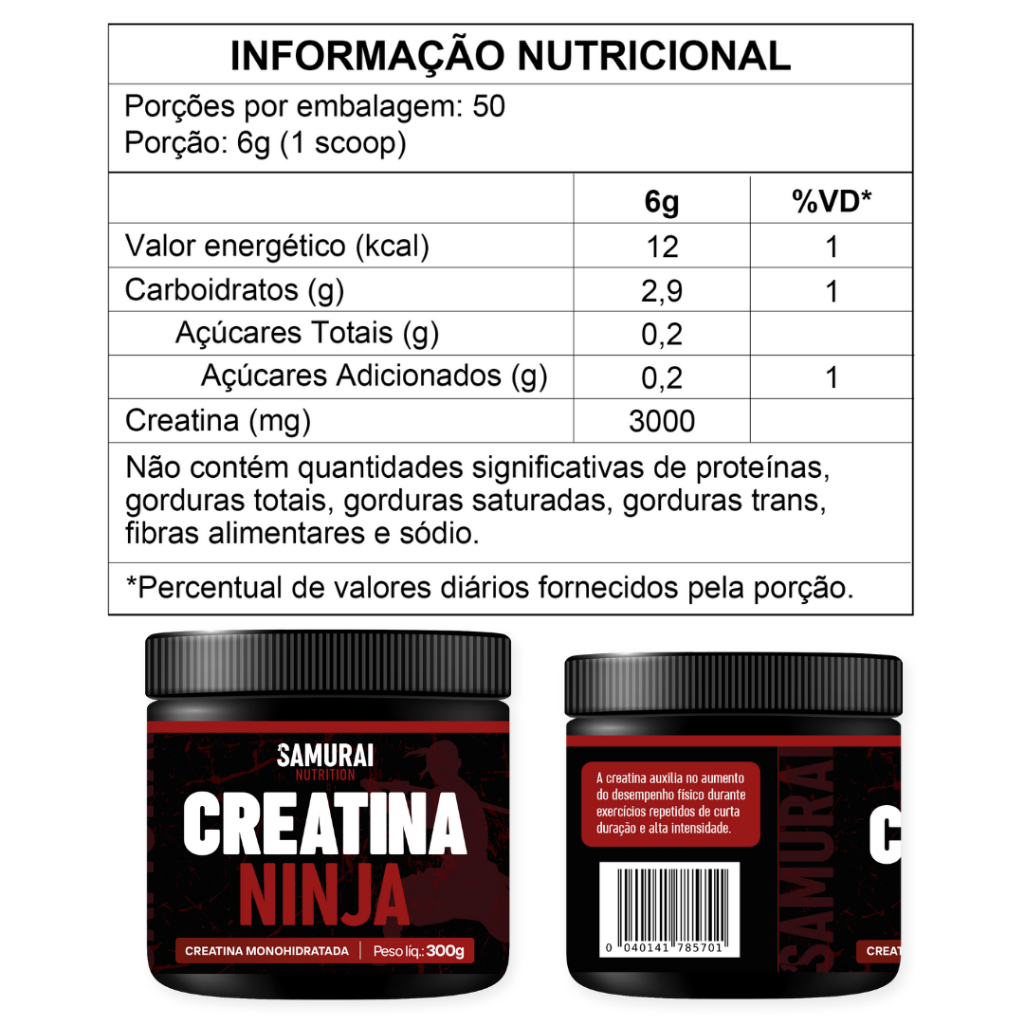 ********************************** CREATINA SAMURAI NUTRITION: ********************************** Prepare-se para elevar seu treino a um novo nível com a Creatina Ninja 150g e 300g com maltodextrina, sua aliada essencial no caminho para o sucesso atlético. Creatina Ninja, revolucionando o mercado fitness com uma fórmula inovadora desenvolvida para maximizar o desempenho atlético. Essa combinação estratégica oferece não apenas os benefícios comprovados da creatina para aumentar a força e a resistência muscular, mas também a adição da maltodextrina para fornecer energia rápida e sustentada durante os exercícios intensos. Combinando a força ancestral da creatina com tecnologia de ponta, este suplemento promete elevar os treinos a um novo patamar de intensidade e eficácia. Prepare-se para experimentar uma explosão de energia, resistência aprimorada e recuperação mais rápida, tudo embalado na praticidade e confiança que só a marca Ninja pode oferecer. Ideal para atletas que buscam alcançar e superar seus limites. ACOMPANHA SCOOP DOSADOR. ************************************ WHEY TURBO 900G BLACKSKULL: ************************************ Como citado acima, quando esses nutrientes são removidos, o produto é uma versão com menos impurezas e com mais soro do leite, ou seja, agora temos Whey Protein na forma concentrada. Whey Protein Concentrado contém geralmente, de 40% a 80% de proteína de alto valor biológico que fornece aminoácidos importantes para a hipertrofia muscular, facilita a construção de tecido muscular, sendo recomendada para a nutrição durante o dia. O Whey Turbo veio para turbinar seus músculos! Com 30g de proteína por porção, ele combina Whey Protein Concentrado com Maltodextrina, que por sua vez contribui na absorção da proteína. INGREDIENTES: Proteína concentrada do soro do leite, maltodextrina, aromatizante e edulcorante sucralose. CONTÉM LACTOSE. NÃO CONTÉM GLÚTEN. MODO DE CONSUMO: Misture 12 colheres de sopa (120g) em 150 a 200 ml de água, uma vez ao dia.