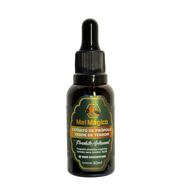 EXTRATO DE PRÓPOLIS VERDE TERROIR + BISNAGA DE 280g DE MEL 100% PURO MEL MÁGICO Produto artesanal Própolis Terroir colhida nas Montanhas Magicas da Mantiqueira. Uma região surpreendente onde habitavam antigas civilizações indígenas de mais de 3.500 anos. Hoje é um parque arqueológico que guarda os vestígios desses povos, como objetos feitos de pedra e pinturas rupestres. É nessa região mágica que nossas abelhas coletam essa própolis de terroir de alta qualidade e muita história. A própolis verde é proveniente de resinas coletadas pelas abelhas de uma planta comum na região, o alecrim do campo, uma das mais pesquisadas e com melhores benefícios para a saúde. Própolis alcoólica orgânica Extrato seco mínimo 16,5%. Indicações: antibiótico natural, atividade anti-inflamatória, imunológica, bactericida, cicatrizante, melhora do sono e disbiose intestinal. Posologia: Crianças de 2 a 12 anos de idade 5 gotas ao dia para profilaxia e 3 x ao dia para tratamento de doença ativa. Adulto 20 gotas ao dia para profilaxia e 20 gotas 3x dia para tratamento de doença ativa. Tomar a noite melhora a qualidade do sono.