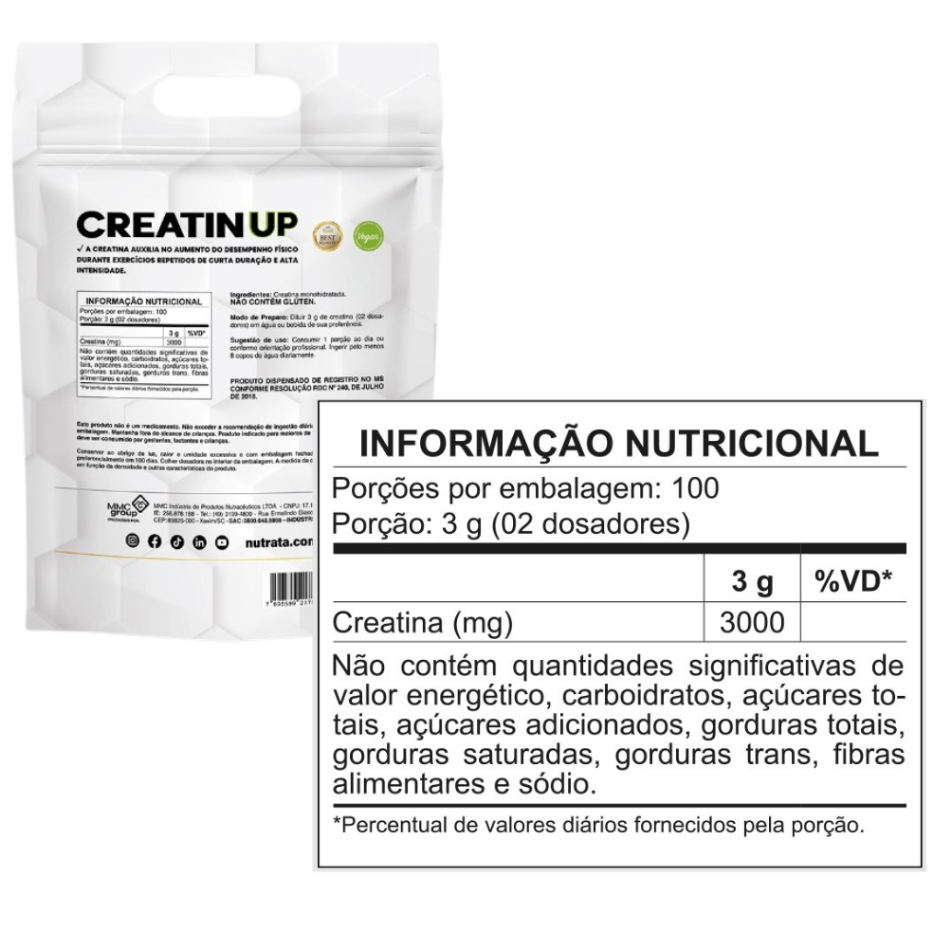**************************** CREATINA 300G NUTRATA: **************************** A Creatin Up é usada principalmente para aumentar força muscular e desempenho. Essa creatina é 100% monohidratada. Além disso, não possui conservantes ou aditivos em sua composição, garantindo maior pureza para o suplemento. Se você procura maior potência muscular para melhorar o desempenho do seu treino, essa é uma boa pedida. O que é creatina monohidratada? A creatina monohidratada é a fórmula cujos efeitos positivos são mais descritos e registrados na literatura científica. Ela pode ser consumida com diversos tipos de líquidos, como água, sucos, chás e outros. Por fim, é o melhor custo-benefício quando o assunto é creatina de qualidade. Como tomar creatina? Em relação a quantidade, procure um médico ou nutricionista para montar um plano alimentar adequado para o seu caso. Quanto ao uso, a creatina deve ser consumida todos os dias e em qualquer horário. Ou seja, mesmo nos dias que você não treina, precisa continuar suplementando. Sugestão e Indicação de Uso: É recomendado consumir 1 porção ao dia ou conforme orientação profissional; Ingerir pelo menos 8 copos de água diariamente. Ingredientes: Creatina monohidratada. NÃO CONTÉM GLÚTEN. ****************************** WHEY W100 NUTRATA 900G: ****************************** O W100 é um suplemento elaborado com a proteína concentrada do soro do leite (WPC) extraída através da microfiltragem de fluxo cruzado (CFM). Esse produto possui alto valor nutricional e elevado teor de aminoácidos essenciais. Além da alta qualidade, possui uma grande variedade de sabores incríveis para deixar a sua dieta ainda mais deliciosa e prática. PROTEÍNA CONCENTRADA, LEVE E DELICIOSA Ingredientes: Proteína de soro do leite concentrada (CFM), doce de leite em pó, aromatizante idêntico ao natural de doce de leite, espessante goma xantana e carragena, antiumectante dióxido de silício, edulcorante sucralose e corante natural de caramelo e artificial amarelo crepúsculo. CONTÉM LACTOSE. ALÉRGICOS: CONTÉM DERIVADOS DE LEITE E SOJA*. NÃO CONTÉM GLÚTEN. *Ingrediente usado no processo de instantaneização da proteína do soro do leite. Contém aromatizante sintético idêntico ao natural. Colorido artificialmente. Modo de preparo: Diluir 30 g (02 dosadores) em 200 ml de água. Sugestão e indicação de uso: Consumir uma a duas porções ao dia. Você pode consumir o W100 no: Pré e pós-treino; Café da manhã e lanches intermediários; Ou conforme orientação de nutricionista ou médico.