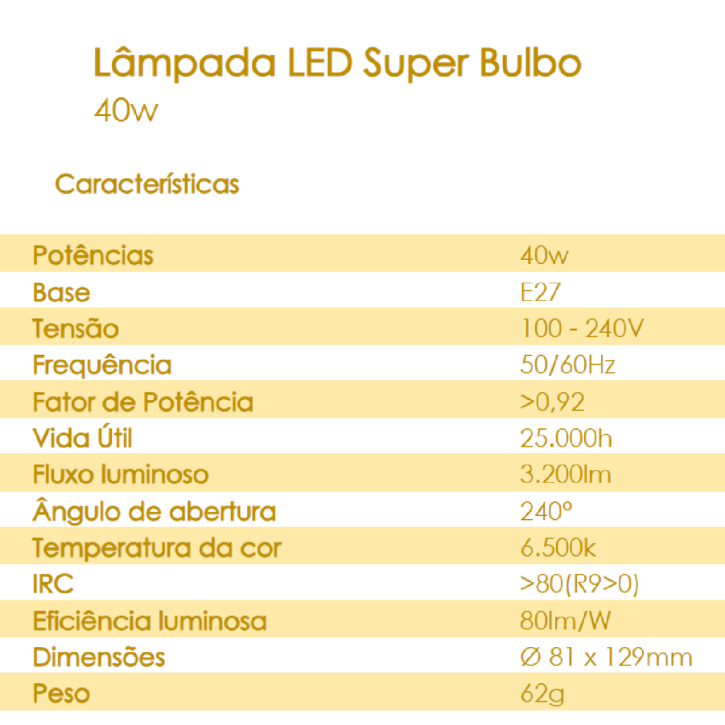 Lâmpada Led Super Bulbo 40w 6500K Bivolt E27 Elgin Possuir uma boa iluminação nos espaços em que estamos influencia a maneira como nos sentimos, relaxamos, trabalhamos ou estudamos. É por isso que as lâmpadas de LED Super Bulbo 40w da Elgin possuem alta potência e luminosidade de alta qualidade, sendo uma excelente opção se você quiser criar um ambiente agradável e funcional. Características do Produto: - Potências nominais disponíveis: 40w; - Soquete: E27; - Tensão nominal: 100V - 240V (Bivolt); - Emissão de luz: 6500K luz branca; - Fluxo Luminoso: 3200lm; - Eficiência luminosa: 80lm/w; - Ângulo de abertura: 240°; - Fator de potência: >0,92; - Vida útil: 25.000h; - IRC: >80 - Material: Plástico, Alumínio; - Corrente nominal: 127V = 179mA / 220 V = 101mA; - Frequência: 50/60Hz; Atenção! - 1 Ano de garantia pelo fabricante.