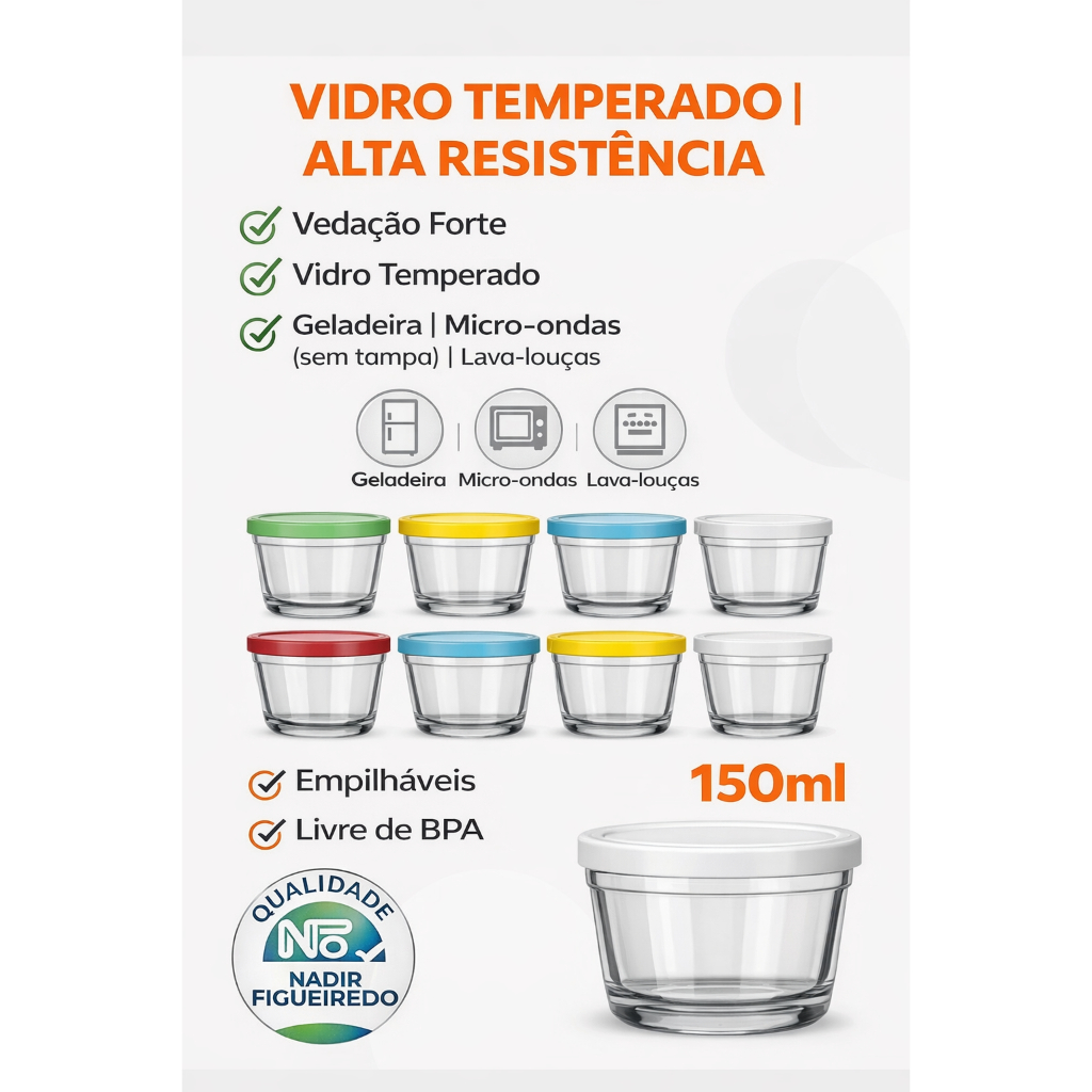 Kit 2/4/6/ Potes de Vidro Nadir 150ml c/ Tampa Tigelas Bowl Multiuso Papinha Micro-ondas, Freezer
