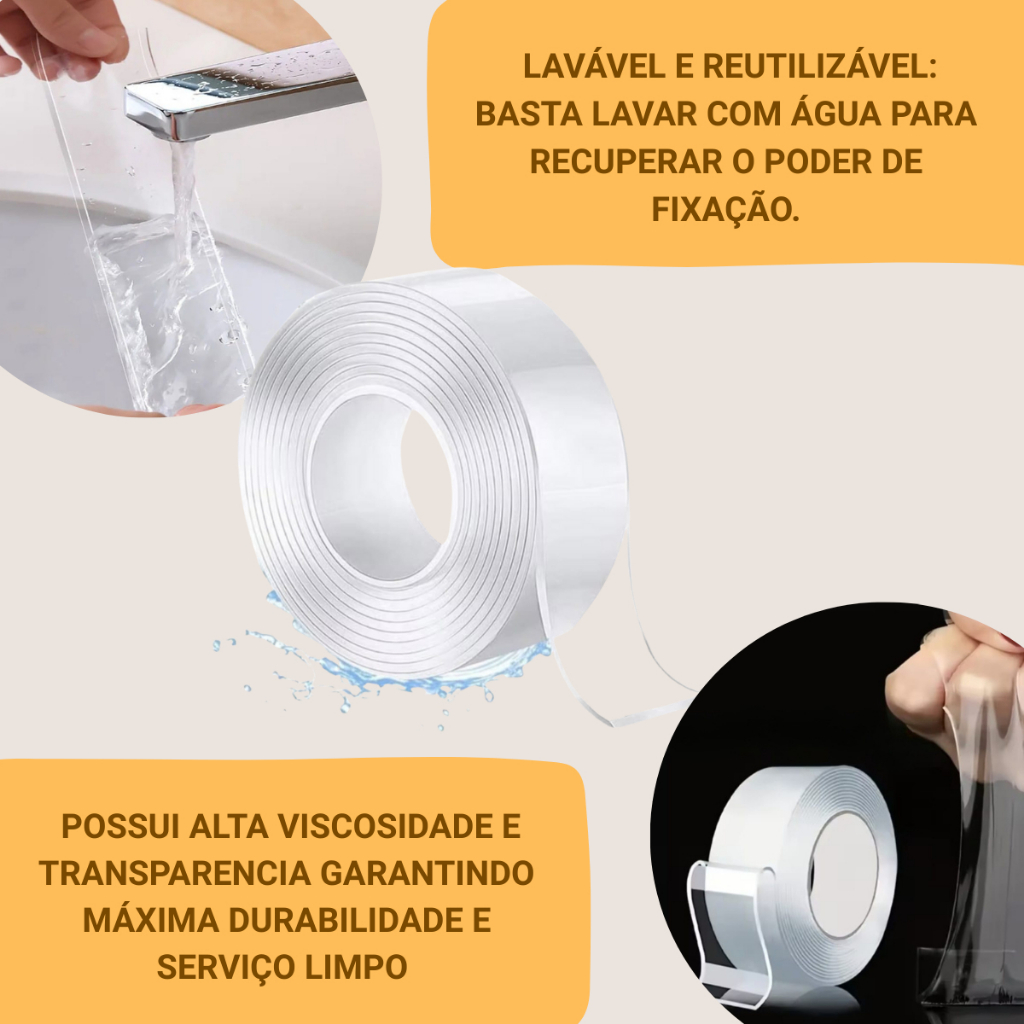 Fitas Dupla Face Adesiva Extra Forte Transforme sua rotina – a solução prática, moderna e versátil para organizar, decorar e fixar objetos sem sujeira e sem esforço! Feita em silicone adesivo de alta qualidade, essa fita é elástica, lavável e reutilizável, garantindo máxima durabilidade e economia. Com adesão poderosa, fixa em diferentes superfícies como azulejo, madeira, vidro, plástico e metal, substituindo pregos, parafusos e colas comuns. Benefícios que fazem a diferença: Adesão imediata e super forte – segura desde objetos leves até os mais pesados. Versatilidade total – ideal para casa, escritório, carro ou qualquer ambiente. Lavável e reutilizável – basta lavar com água para recuperar o poder de fixação. Praticidade no dia a dia – corte no tamanho desejado, cole e pronto! Sem furos e sem sujeira – preserve suas paredes e móveis com acabamento limpo e elegante. Exemplos de uso: Fixar quadros, fixar carpetes,fotos e decorações sem furar a parede. Organizar cabos e acessórios de forma prática. Colocar o celular no carro ou na cozinha enquanto cozinha. Manter móveis firmes e livres de deslizamentos. Guardar controles, escovas de dente e pequenos objetos em locais estratégicos. As possibilidades são infinitas – a imaginação é o limite! Especificações Técnicas: Cor: Transparente Material: Nano Gel de silicone Espessura: 1 mm Comprimento por rolo: 3 metros Largura: 3cm