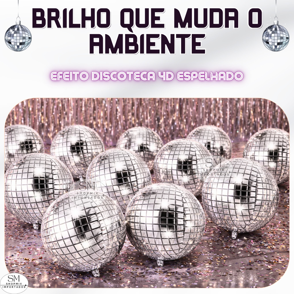 | Kit 2, 5, 10 ou 20 Balao Metalizado Espelhado Discoteca Globo 4D Or... este produto | R$ 13,90 | 26% | 4.8/5 | 101 |