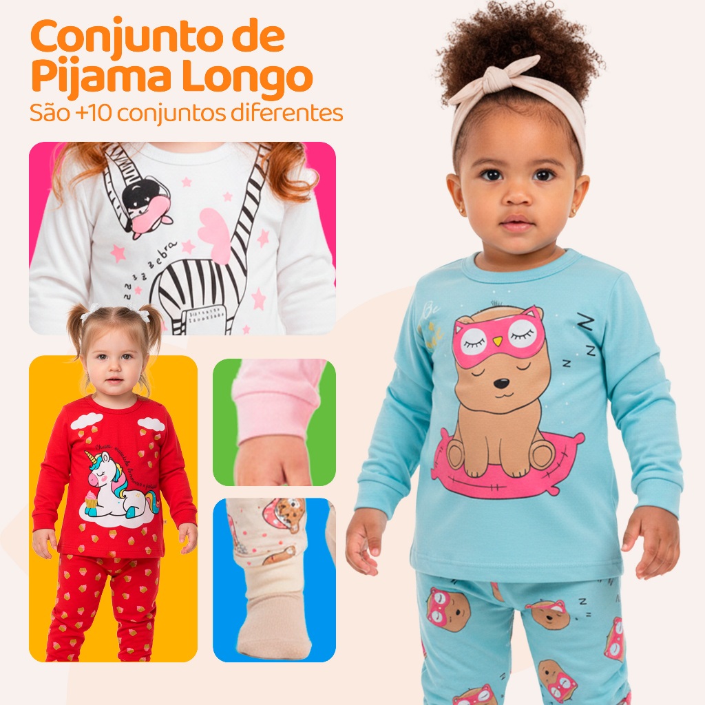 Pijama Longo Feminino Kit Pijama Infantil Feminino – Camiseta Manga Longa + Calça (Peças Sortidas) 🌟 Escolha entre 3 opções de kit: Kit com 1 conjunto: 1 camiseta + 1 calça (2 peças no total) Kit com 3 conjuntos: 3 camisetas + 3 calças (6 peças no total) Kit com 5 conjuntos: 5 camisetas + 5 calças (10 peças no total) ⚠️ Todas as peças são enviadas de forma sortida, conforme a disponibilidade em estoque. Não é possível escolher estampas ou cores. Características do Produto: ✅ Camiseta confeccionada em 100% algodão – ideal para noites confortáveis ✅ Estampas e cores variadas, divertidas e alegres ✅ Tecido leve e macio, ideal para a pele delicada das crianças ✅ Calça com elástico na cintura para mais conforto Tabela de Medidas Camiseta Manga Longa Tamanho 1 – Busto: 26 cm | Comprimento: 38 cm | Manga: 34 cm Tamanho 2 – Busto: 27 cm | Comprimento: 39 cm | Manga: 35 cm Tamanho 3 – Busto: 28 cm | Comprimento: 41 cm | Manga: 37 cm Tamanho 4 – Busto: 30 cm | Comprimento: 44 cm | Manga: 40 cm Tamanho 6 – Busto: 33 cm | Comprimento: 46 cm | Manga: 41 cm Tamanho 8 – Busto: 34 cm | Comprimento: 47 cm | Manga: 43 cm Tamanho 10 – Busto: 34 cm | Comprimento: 48 cm | Manga: 45 cm Calça Pijama Tamanho 1 – Cintura: 19 cm | Comprimento: 48 cm Tamanho 2 – Cintura: 20 cm | Comprimento: 49 cm Tamanho 3 – Cintura: 21 cm | Comprimento: 51 cm Tamanho 4 – Cintura: 23 cm | Comprimento: 60 cm Tamanho 6 – Cintura: 24 cm | Comprimento: 68 cm Tamanho 8 – Cintura: 25 cm | Comprimento: 70 cm Tamanho 10 – Cintura: 25 cm | Comprimento: 73 cm Importante! • Em até 2 kits do mesmo tamanho: garantimos variedade sem repetição 📦 Envio em até 24h úteis para pedidos realizados até as 13h. Garanta já o seu kit e proporcione conforto, estilo e diversão para sua pequena!
