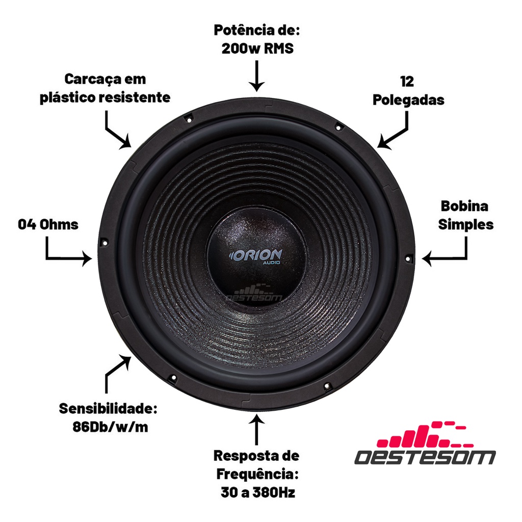 SUBWOOFER 12' 200W Utilizados para sistema de som interno, os subwoofers reproduzem sub graves com muita qualidade (Pancadões). Com 12 polegadas de diâmetro, 200W RMS de potência em 4 Ohms, bobina simples, ótima resposta de frequência e sensibilidade, uma ótima opção para a instalação do som do seu carro. Especificações técnicas: 12 polegadas 200W RMS (cada) 4 Ohms Bobina Simples Resposta de frequência 30 a 380Hz Sensibilidade 86dB/w/m Carcaça em plástico resistente FABRICANTE: ORION AUDIO Conteúdo da embalagem: 2 SubWoofer.