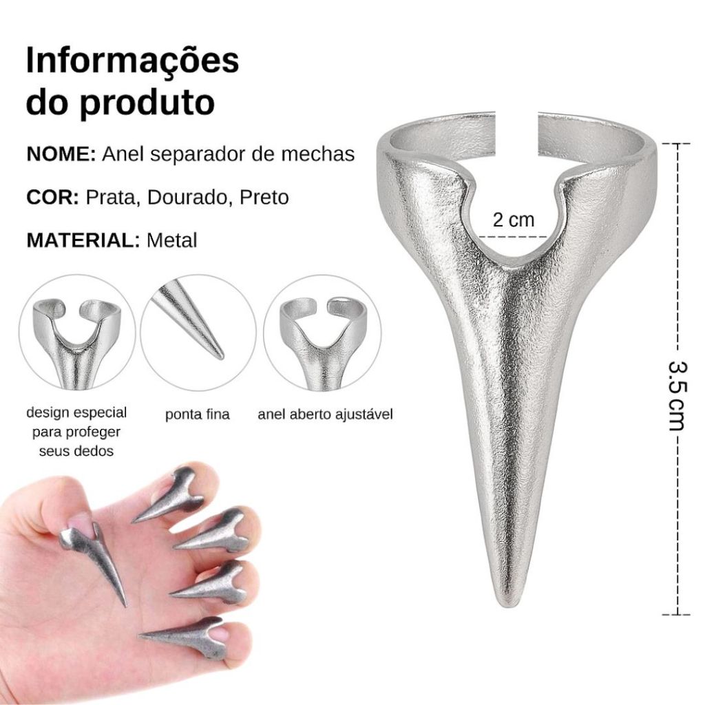 ✨ Anel Separador de Mechas Profissional ✨ Tenha mais praticidade e precisão na hora de separar mechas com esse acessório indispensável para trancistas, cabeleireiros e amantes da beleza! ✅ Praticidade: facilita a separação das mechas de forma rápida e precisa. ✅ Segurança: design especial que protege seus dedos durante o uso. ✅ Conforto: anel aberto e ajustável, que se adapta ao tamanho do seu dedo. ✅ Durabilidade: feito em metal resistente, disponível nas cores Prata, Dourado e Preto. ✅ Versatilidade: ideal para processos de escovação, corte, coloração, tranças e finalizações. 📏 Medidas: 3,5 cm de altura | 2 cm de largura 🎨 Cores disponíveis: Prata | Dourado | Preto 📦 Opções de kits: escolha o que melhor se adapta ao seu trabalho. 💇♀️ Profissionais de beleza já usam esse acessório para otimizar tempo e garantir resultados mais perfeitos em seus trabalhos.