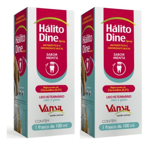 - Indicado para cães e gatos; - Ideal para ajudar seu pet a se ver livre do mau hálito; - Pode ser utilizado como antisséptico da boca e garganta; - Auxilia no tratamento das infecções da mucosa bucal, gengiva e garganta, - Disponível em embalagens de 50 ml e 100 ml. Detalhes Além de melhorar o hálito do cachorro ou gato, o antisséptico ajuda a combater diversas infecções na boca, na gengiva e na garganta do seu amiguinho. De uma forma simples e eficaz, o produto deixa o peludo com a saúde bucal bem mais saudável! Claro que um produto tão incrível só poderia ser desenvolvido pela Vansil. A marca é referência quando o assunto é saúde animal. Há mais de 15 anos no segmento pet, a empresa tem o objetivo de oferecer os melhores produtos de higiene para nossos mascotes. Dicas Especiais Além da escovação dos dentes, outros cuidados devem ser tomados para uma boa higiene bucal. Por isso, você precisa conhecer o antisséptico e odorizante Hálito Dine que a Vansil preparou para seu cachorro ou gatinho de estimação. Desenvolvido por uma equipe de especialistas em saúde animal, o Hálito Dine spray traz vários benefícios importantes, como: - Combate e evita o mau hálito; - Previne e trata infecções bucais e de garganta, - Apresenta fácil modo de aplicação. Já deu para notar o quanto o Hálito Dine é bom para a saúde bucal de seu amigo de quatro patas, não é mesmo? Aproveite para conferir mais detalhes sobre o produto! Composição Digluconato de clorhexidina (20%),Menta,Água destilada