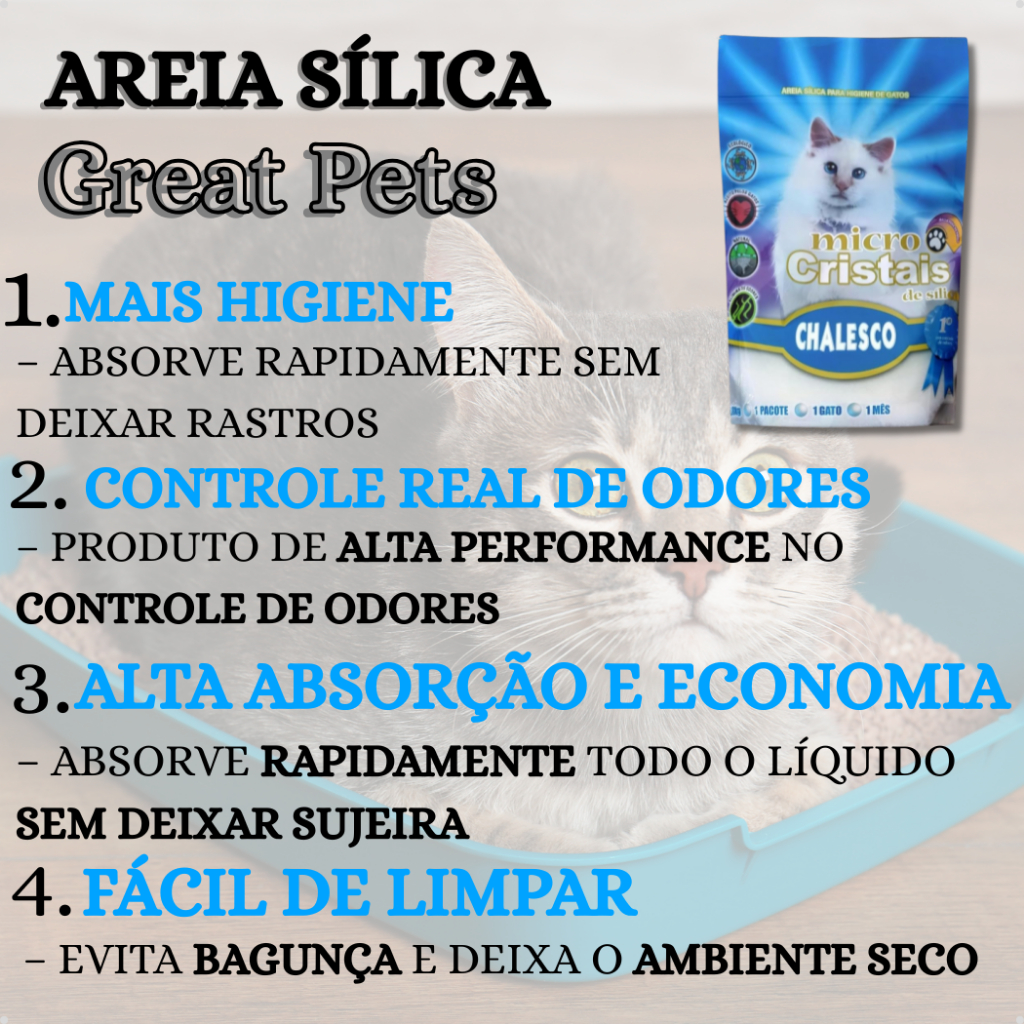 Areia Sílica Fina para Gatos Chalesco – Alta Absorção, Controle de Odor, Atóxica – 1,8kg Chega de mau cheiro e bagunça! A Areia Sílica Fina Chalesco foi desenvolvida para tutores que buscam praticidade máxima no dia a dia e querem manter a casa sempre limpa, sem odores desagradáveis. Feita com micro cristais de qualidade premium, ela absorve rapidamente a urina e retém odores com eficiência, mantendo a caixa de areia sempre seca por muito mais tempo. Além disso, é atóxica, rende mais e não gruda nas patinhas, garantindo higiene para você e conforto para o seu gatinho. Ideal para quem busca um produto simples, seguro e eficiente. Principais Benefícios: - Altíssimo poder de absorção - Controle eficaz de odores - Produto atóxico – seguro para seu gato - Zero rastros pela casa – não gruda nas patinhas - Rende mais do que areias comuns - Grãos finos – ideal para alta absorção - Fácil limpeza Para quem é ideal: Tutores que buscam reduzir mau cheiro no ambiente Apartamentos e espaços pequenos Gatos que espalham areia fina pela casa Quem busca praticidade e boa duração Modo de uso: Preencher a caixa com cerca de 4cm de sílica Remover os sólidos diariamente Trocar completamente quando perder eficiência Ficha Técnica: Produto: Kit 2 Areia Sílica Fina Marca: Chalesco Indicação: Gatos Função: Absorção de urina e controle de odor Peso: 1,8kg Granulometria: Fina Aroma: Sem perfume Segurança: Atóxica Rendimento: Superior a areias comuns Limpeza: Fácil Rastro: Baixo