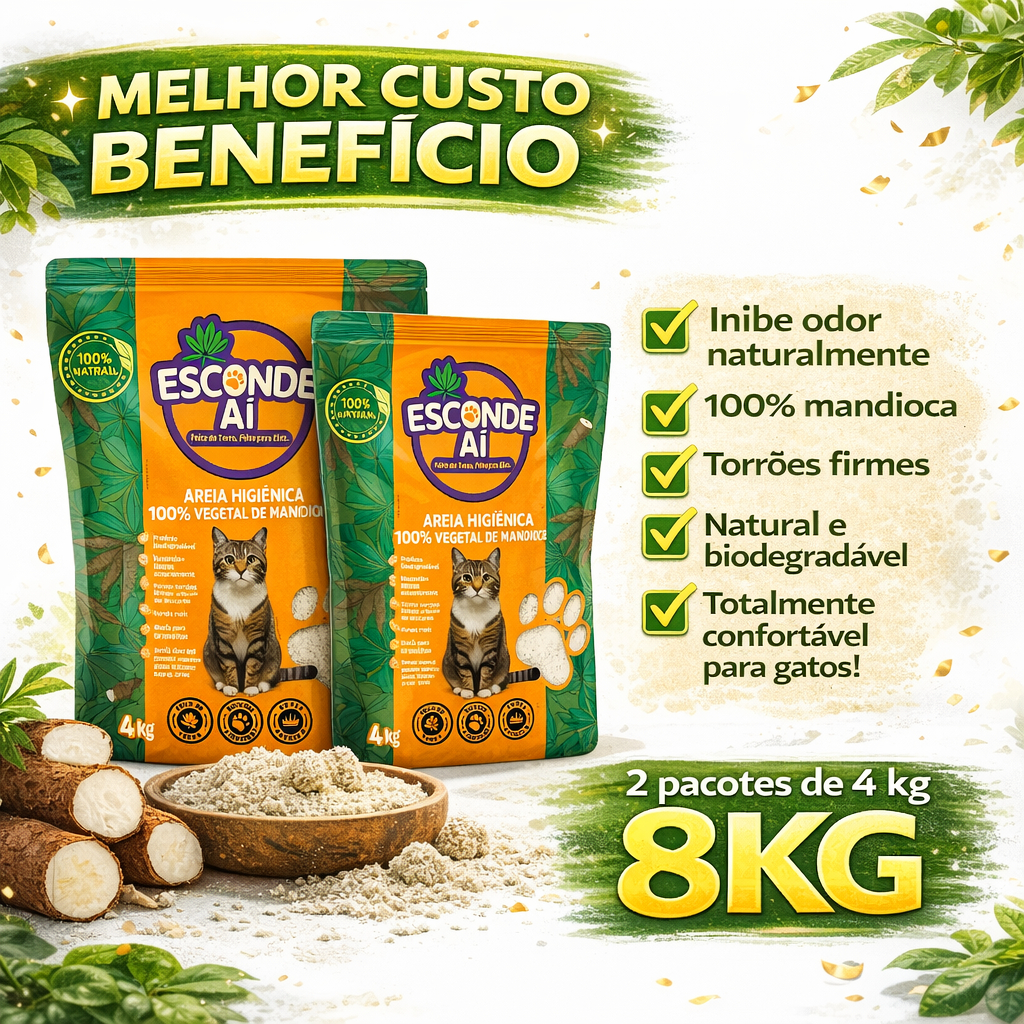 Você procura uma areia higiênica natural, segura e com alto desempenho para o seu gato? CARACTERÍSTICAS – Feita 100% de mandioca – Produto vegetal e biodegradável – Sem milho, sem glúten e sem misturas – Aglomeração forte e instantânea – Torrões firmes que não se desfazem na pá – Controle avançado de odores – Grãos macios ideais para patas sensíveis – Sem conservantes, sem fragrâncias e sem aditivos químicos – Torrões que se dissolvem em água – Pode ser descartada no vaso sanitário em pequenas quantidades – Limite de compra: 30 kg por pedido POR QUE ESCOLHER "ESCONDE AÍ"? – Aglomeração eficiente que facilita a limpeza diária – Neutralização de odores por mais tempo – Textura confortável que oferece melhor aceitação pelos gatos – Composição totalmente pura e segura – Alta absorção que mantém o ambiente fresco – Alternativa sustentável e ecológica – Praticidade no descarte, evitando acúmulo de lixo – Ideal para filhotes, gatos adultos e idosos DICAS DE USO – Coloque cerca de cinco centímetros de areia na bandeja – Retire torrões e fezes diariamente – Descarte pequenas quantidades no vaso sanitário ou no lixo comum – Complete a bandeja sempre que necessário – Para adaptação, misture um pouco da areia anterior nos primeiros dias PERGUNTAS FREQUENTES (FAQ) – É feita exclusivamente de mandioca? Sim, composta apenas por mandioca selecionada. – Possui mistura com milho? Não, é totalmente pura, sem misturas. – Contém aditivos químicos? Não, é livre de conservantes e fragrâncias artificiais. – Posso descartar no vaso sanitário? Sim, sempre em pequenas quantidades para dissolução adequada. – Controla bem os odores? Sim, graças à alta absorção natural da mandioca. – Os torrões são firmes? Sim, eles não se desfazem durante a retirada. – É segura para filhotes? Sim, é natural, macia e não irrita as patas. Se você busca conforto, eficiência e uma solução sustentável, esta areia é a melhor escolha para o seu gato e para o ambiente.