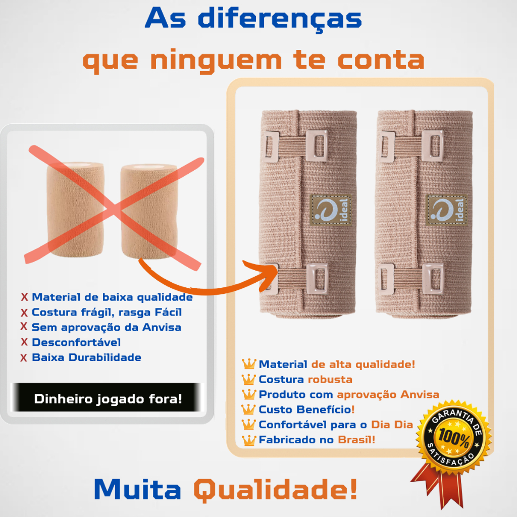 Produto enviado diretamente da Fábrica. Os dois rolos dentro da embalagem são de única cor, não é possível mescla-los. Acompanha presilhas para fixação. Benefícios da Atadura Elástica: - Indicado para enfaixamentos diversos na prática de esportes e exercícios físicos fornecendo proteção à região enfaixada. - Indicado também para pós-tratamento esclerosante de varizes, nos enfaixamentos de úlceras varicosas e na redução de inchaços dos membros. Tamanho Único : * 1,5 metro em repouso. * 4,5 metros esticado * 10 cm de largura. Composição: 60% algodão, 30% elastano e 10% poliamida. Embalagem: Contém 2 (dois) rolos, cada um com 0,10m (altura) X 4,50m (comprimento esticado). Forma de uso / Colocação: 01 – Enfaixe a região necessitada adequadamente fornecendo compressão saudável. 02 – Após o enfaixamento, fixe o produto através das presilhas. ANVISA: AF Nº 8.04.537-8 Responsável Técnica: Dra. Graziele Cristina Silva de Moraes – CREFITO-3 Nº 316034-F CREFITO: RE Nº 5435-SP