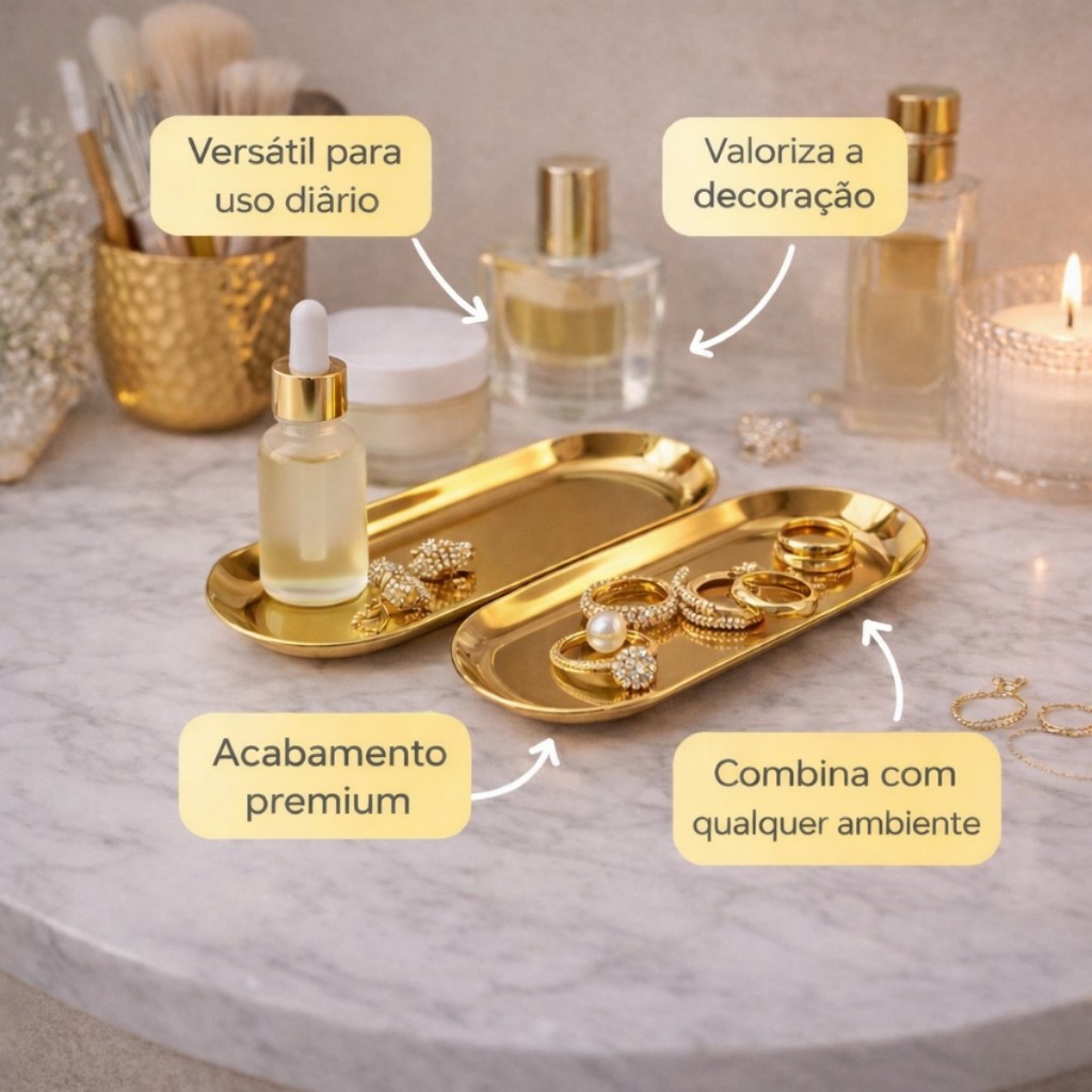 Kit 2 Bandeja Dourada Oval Luxo Espelhada Acessório Aço Inox Cozinha Banheiro Lavabo Toalete