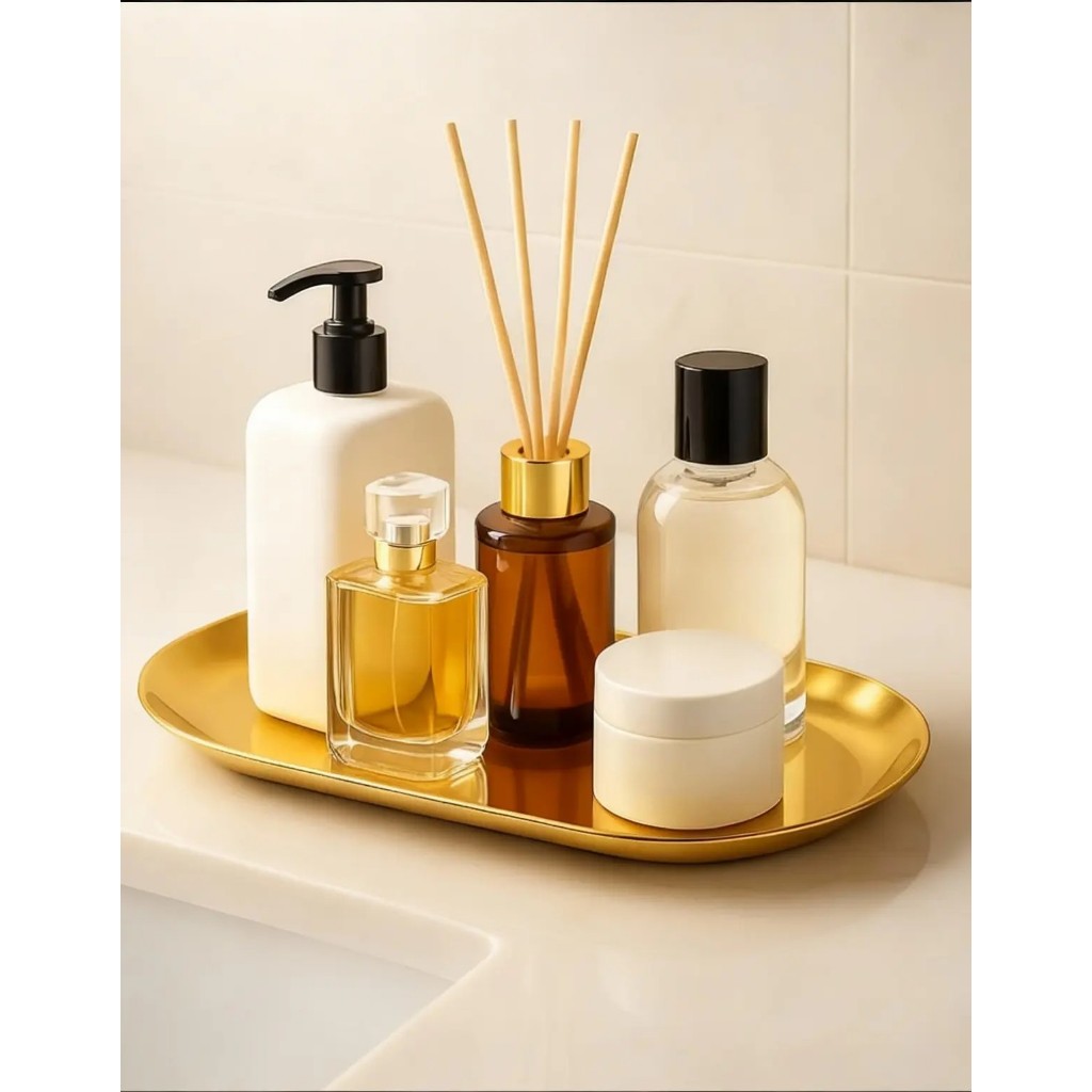 O Kit com 2 Bandejas Douradas Espelhadas Decorativas é a escolha ideal para quem busca decoração sofisticada, organização prática e acabamento premium. Fabricadas em aço inoxidável de alta qualidade, essas bandejas possuem formato oval moderno, com acabamento dourado espelhado, trazendo um visual elegante que valoriza qualquer ambiente. Muito procuradas como bandeja decorativa para lavabo, bandeja para perfumes, bandeja organizadora de cosméticos e bandeja luxo para decoração, são versáteis e funcionais, combinando perfeitamente com estilos modernos, clássicos e minimalistas. Principais Benefícios e Diferenciais Bandeja dourada espelhada decorativa de alto brilho Produzida em aço inox (não enferruja) Design oval elegante e atemporal Ideal para lavabo, penteadeira, sala, quarto e escritório Perfeita para organizar perfumes, joias, cosméticos e acessórios Fácil de limpar e manter Item decorativo de alto valor visual Excelente opção para decoração de festas e eventos Especificações Técnicas do Produto Produto: Bandeja decorativa dourada espelhada Material: Aço inoxidável Cor: Dourado espelhado Formato: Oval Quantidade: Kit com 2 bandejas - Escolha o Tamanho acima Excelente Opção de Presente Um acessório útil, sofisticado e versátil — perfeito para presentear colegas.