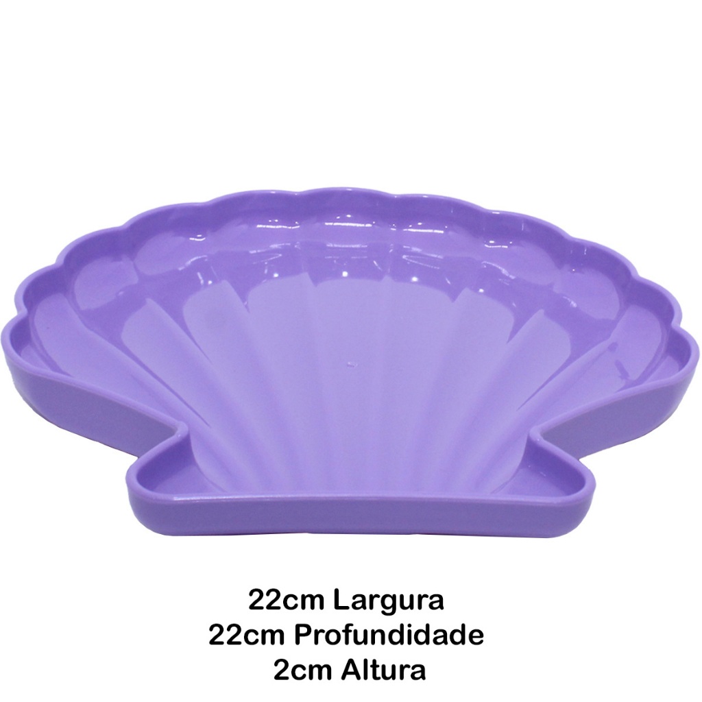 Bandeja Concha decorativa perfeita para decorações temáticas sereia e fundo do mar. Quantidade: 02 peças Medidas: 2cm altura x 22cm largura x 22cm profundidade. Material: plástico poliestireno. Cores: Azul Rosa Lilás Branco Perola