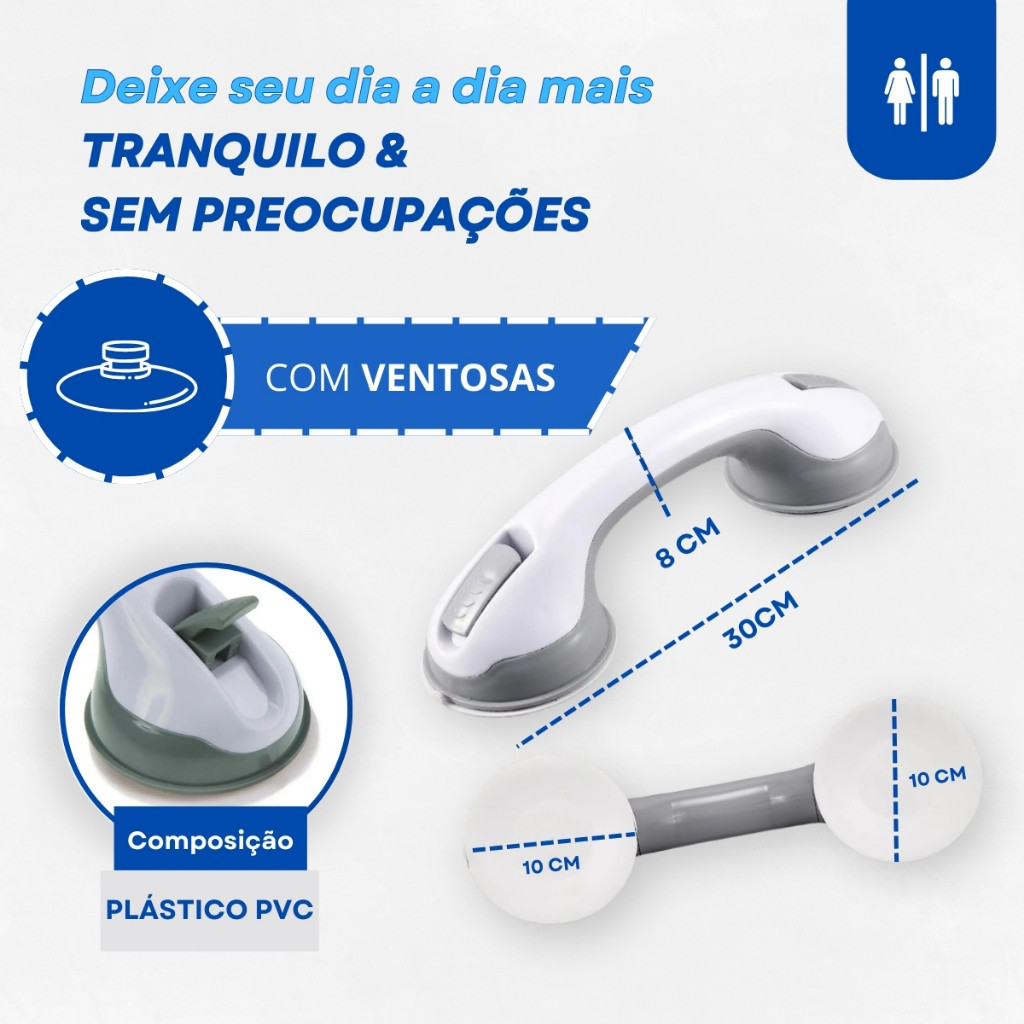 O Conjunto de 2 Barras de Apoio é uma solução prática e segura para facilitar a mobilidade de idosos e deficientes no banheiro. Fabricado em PVC de alta qualidade, esse produto inovador oferece suporte sem a necessidade de instalação permanente, sendo ideal para fixação em superfícies de vidro ou azulejos. Características Principais: Material Durável: Fabricado em PVC resistente, o conjunto de barras é leve, porém robusto, garantindo durabilidade e resistência ao desgaste. Versatilidade de Instalação: Equipado com ventosas de 8,5 cm de diâmetro, o kit pode ser facilmente fixado e removido em diferentes superfícies, sem causar desarrumação ou sujeira. Isso proporciona flexibilidade ao usuário para ajustar as barras de acordo com suas necessidades. Segurança do Usuário: A atenção à segurança do usuário é uma prioridade. Recomendamos a instalação adequada do produto em todas as suas utilizações. Para garantir a estabilidade, é essencial retirar e fixar novamente as barras antes de cada uso. Supervisão e Inspeção: Dado que o produto não é fixado na parede com parafusos, é aconselhável a supervisão de um terceiro durante a utilização. Além disso, é necessário realizar inspeções regulares para garantir que o equipamento esteja seguro e estável. Dados Técnicos: Material: PVC Dimensões: 29,5 x 8,5 cm Ventosas: 8,5 cm de diâmetro Peso: 250g (cada) Dimensões: Largura: 9.00 cm Altura: 8.00 cm Comprimento: 30.00 cm Peso: Peso Líquido: 0.47 kg
