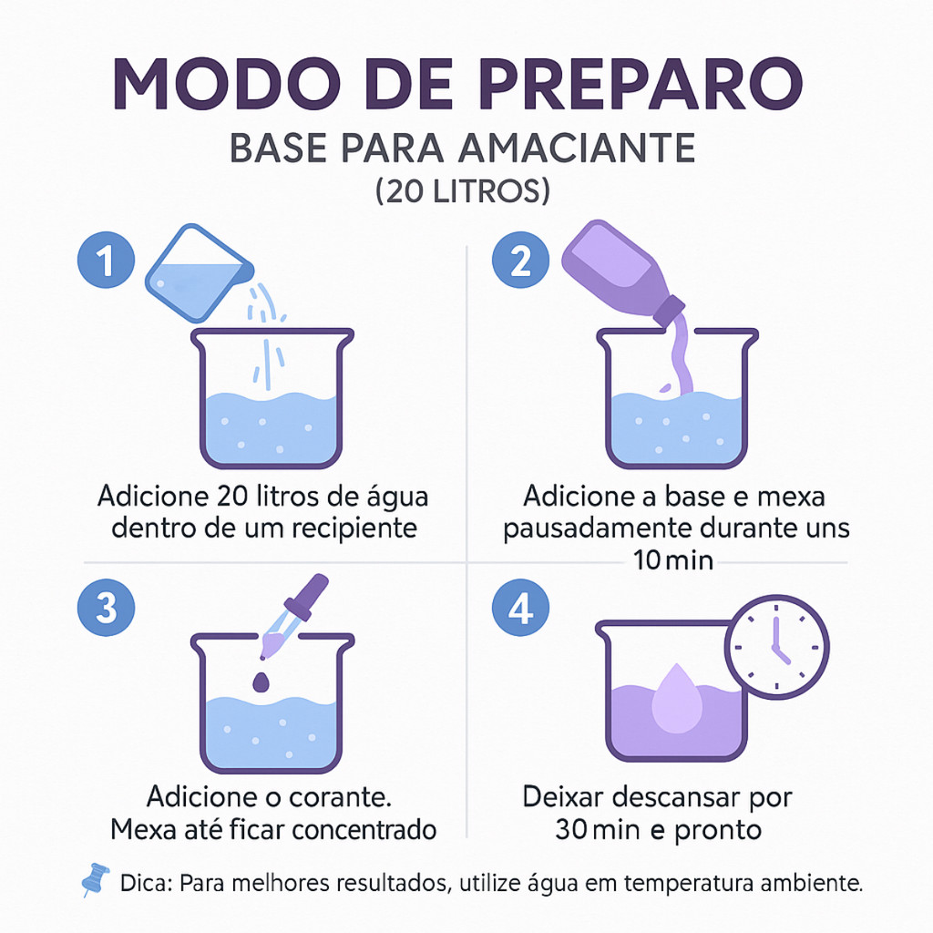 Kit 2 Base Concentrada para Preparo de Amaciante Premium – 100ml Rende até 40 Litros de Amaciante de Alta Qualidade! Transforme sua rotina de cuidados com as roupas com esta base concentrada para amaciante premium, prática, econômica e super perfumada! Ideal para quem busca maciez, proteção dos tecidos e um perfume duradouro, tudo isso sem abrir mão da economia e da qualidade. ===== Benefícios: - Alto Rendimento: 2 frascos de 100ml rende até 40 litros de amaciante. - Perfume Marcante e Duradouro: Já vem com essência! Perfuma as roupas por muito mais tempo. - Proteção das Roupas: Reduz o desgaste dos tecidos durante a lavagem, preservando suas peças por mais tempo. - Economia Inteligente: Faça em casa um amaciante de qualidade premium com baixo custo por litro. ====== 🧪 Modo de Preparo (Simples e Rápido): Em um recipiente limpo, adicione 40 litros de água tratada (não utilize água de poço, rio, lago ou mar). Acrescente lentamente o conteúdo das garrafinhas (200ml) à água, mexendo sempre. Misture bem por 10 a 15 minutos, até obter uma textura homogênea. Adicione o corante Deixe a mistura “descansar” por 30 minutos para estabilizar. Pronto! Seu amaciante premium perfumado está pronto para uso ou envase. ===== 📦 Você Receberá: 2 Frasco de 100ml de base concentrada perfumada (para preparar 20 litros de amaciante). 2 Corante (Azul ou roxo) 💡 Ideal para uso doméstico ou revenda! Surpreenda-se com o resultado profissional e o perfume encantador que essa base proporciona às suas roupas.