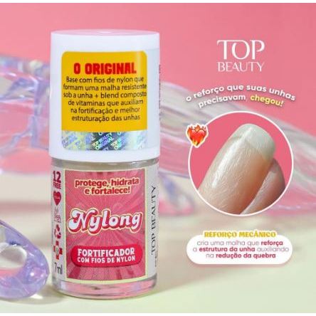 ESSE KIT CONTÉM 2 ITENS: (1 UN) BASE CONCRETO: AUMENTA A LIGAÇÃO DAS PROTEÍNAS E ENDURECE AS UNHAS. (1 UN) BASE NYLONG (12 FREE): COM FIOS DE NYLON QUE FORMAM UMA MALHA RESISTENTE SOB A UNHA + BLEND COMPOSTO DE VITAMINAS QUE AUXILIAM NA FORTIFICAÇÃO E MELHOR ESTRUTURAÇÃO DAS UNHAS. * PRODUTO ORIGINAL TOP BEAUTY * PRODUTO NÃO TESTADO EM ANIMAIS * CADA FRASCO CONTÉM 7ML *** MODO DE USAR: *** - Pode ser usada como “base coat” (por baixo de outro esmalte) ou somente como base incolor. - Em caso de hipersensibilidade a algum dos produtos suspenda o uso! *** DUVIDAS FREQUENTES: *** P: Qual a validade das bases? R: A validade dos produtos são de 3 anos. P: Qual a porcentagem de formol do concreto? R: É permitido pela Anvisa 5% em ml, porém após estudos a Top Beauty concluiu que com apenas 3,5% em ml de formol, oferece resultado e garantia do produto. LEMBRANDO QUE APENAS A “BASE CONCRETO” POSSUI FORMOL