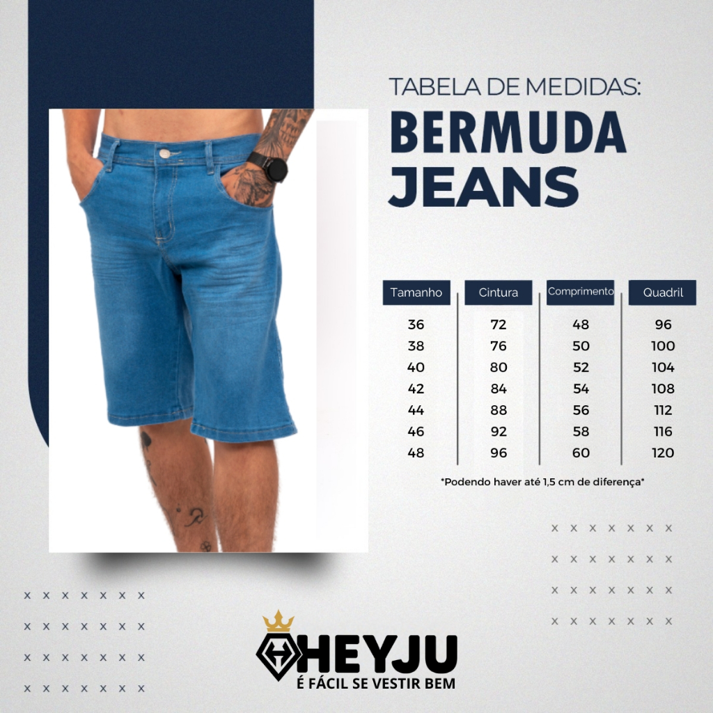 Kit 2 Bermudas Jeans Masculina Lycra Elastano A bermuda jeans masculina é a escolha perfeita para quem busca estilo e conforto nos dias mais quentes. Com um design moderno e casual, ela pode ser usada em diversas ocasiões, desde um passeio no parque até um happy hour com os amigos. Especificações: - 02 bolsos frontais e 02 bolsos traseiros - Costura reforçada - Botões de ferro e zíper reforçado. Tabela de medidas: -Tamanho P veste 36-38 -Tamanho M veste 40-42 -Tamanho G veste 44-46 -Tamanho GG veste 46-48 -Tamanho G1 veste 48-50 -Tamanho G2 veste 52-54 Dúvidas frequentes: -Produto acompanha nota fiscal? Sim, todos os nossos produtos acompanham a nota fiscal. - Tem a pronta entrega? Sim, todos os produtos anunciados estão disponíveis para envio imediato. - O produto é novo? Sim, todos os produtos são novos. Somos a loja da marca Heyju. - Ainda precisa de ajuda? Utilize o campo de perguntas e esclareça suas dúvidas diretamente com um de nossos atendentes. Quem somos? Desde 1978, produzimos roupas para marcas brasileiras. Em 2015, lançamos a Heyju, criando peças próprias com carinho. Expandimos online em 2017, destacando-nos nos principais marketplaces. Na Heyju, unimos moda e estilo para que todos possam se vestir bem. Bem-vindos à Heyju!