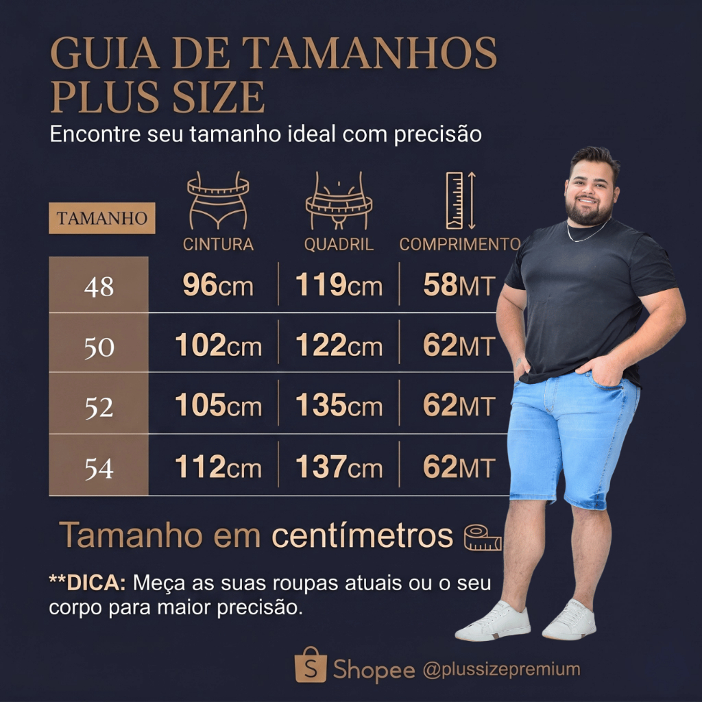1. Conforto e Mobilidade Modelagem pensada para corpos maiores, garantindo um caimento adequado. Tecidos com elastano proporcionam mais flexibilidade e liberdade de movimento. 2. Estilo e Versatilidade Fácil de combinar com camisetas, polos ou camisas sociais, criando looks casuais e modernos. Disponível em diferentes lavagens e cortes, permitindo variação no estilo. 3. Durabilidade O jeans é um tecido resistente, garantindo que a peça dure por muito tempo. Ótima opção para uso diário, pois não desgasta facilmente. 4. Autoestima e Confiança Modelos desenvolvidos para valorizar o corpo, proporcionando um caimento confortável e estiloso. Opções modernas e atualizadas com tendências da moda plus size. 5. Praticidade Fácil de lavar e manter, sem necessidade de cuidados especiais. Peça coringa no guarda-roupa, ideal para diversas ocasiões, desde passeios casuais até eventos descontraídos. Se você busca uma peça confortável, estilosa e durável, a bermuda jeans plus size é uma excelente escolha! Tabela de Tamanho nas fotos acima :)