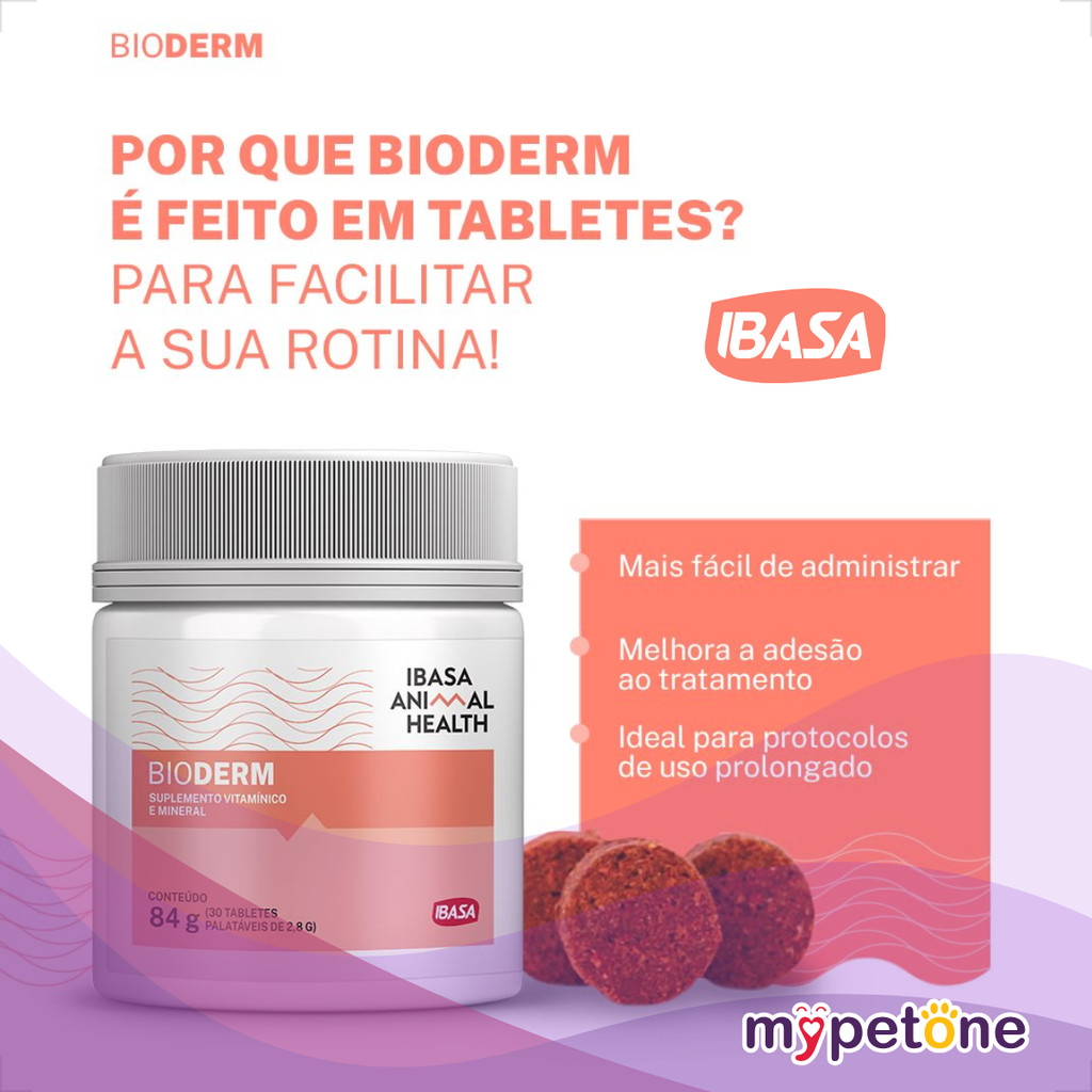 Suplemento Bioderm Ibasa para Cães e Gatos - 30 Tabletes O Bioderm é um suplemento nutricional completo, ideal para promover o equilíbrio da saúde da pele e da pelagem de cães e gatos. Sua fórmula exclusiva age de dentro para fora, fortalecendo o eixo intestino-pele, especialmente em casos que exigem cuidados dermatológicos específicos. Benefícios: - Rico em ômegas: Alta concentração de ácidos graxos essenciais, incluindo o GLA (ácido gama-linolênico), com ação anti-inflamatória e regeneradora da pele. - Com simbiótico: Combinação de prebiótico e probiótico que favorece a microbiota intestinal e impacta positivamente na saúde cutânea. - Fortalece a imunidade: Contém zinco, vitamina D3 e nutrientes que apoiam a integridade da pele e o sistema imune. - Altamente palatável: Tabletes saborosos e de fácil administração. Indicação: Indicado para cães e gatos de todas as idades que necessitam de suporte nutricional para a saúde da pele e da pelagem. Composição Básica: Óleo refinado de peixe, óleo de girassol, óleo de borragem (GLA), biomassa de microalgas, probióticos (Lacticaseibacillus paracasei), extrato de parede de levedura, vitamina D3, zinco quelato, hidrolisado de fígado de suínos, entre outros nutrientes funcionais. Níveis de Garantia (por tablete): - DHA: 11,90 mg - EPA: 23,10 mg - Ácido linoleico: 150 mg - Ácido oleico: máx. 100 mg - Zinco: 37 mg - Vitamina D3: 5.000 UI - Prebióticos (MOS): 120 mg - Probióticos: 5,6 x 105 UFC Modo de Uso: Administrar 1 tablete ao dia para cada 10 kg de peso corporal, ou conforme recomendação do médico-veterinário. Pode ser oferecido diretamente ou misturado ao alimento. Conservação: Conservar em local seco e fresco, entre 15 °C e 30 °C, ao abrigo da luz solar direta. Após aberto, consumir em até 90 dias. Informações Adicionais: - Apresentação: Tabletes - Indicação: Cães e gatos de todas as fases da vida - Categoria: Suplemento vitamínico, mineral e funcional Com o Bioderm, seu pet recebe o suporte necessário para uma pele saudável, pelagem bonita e organismo em equilíbrio!