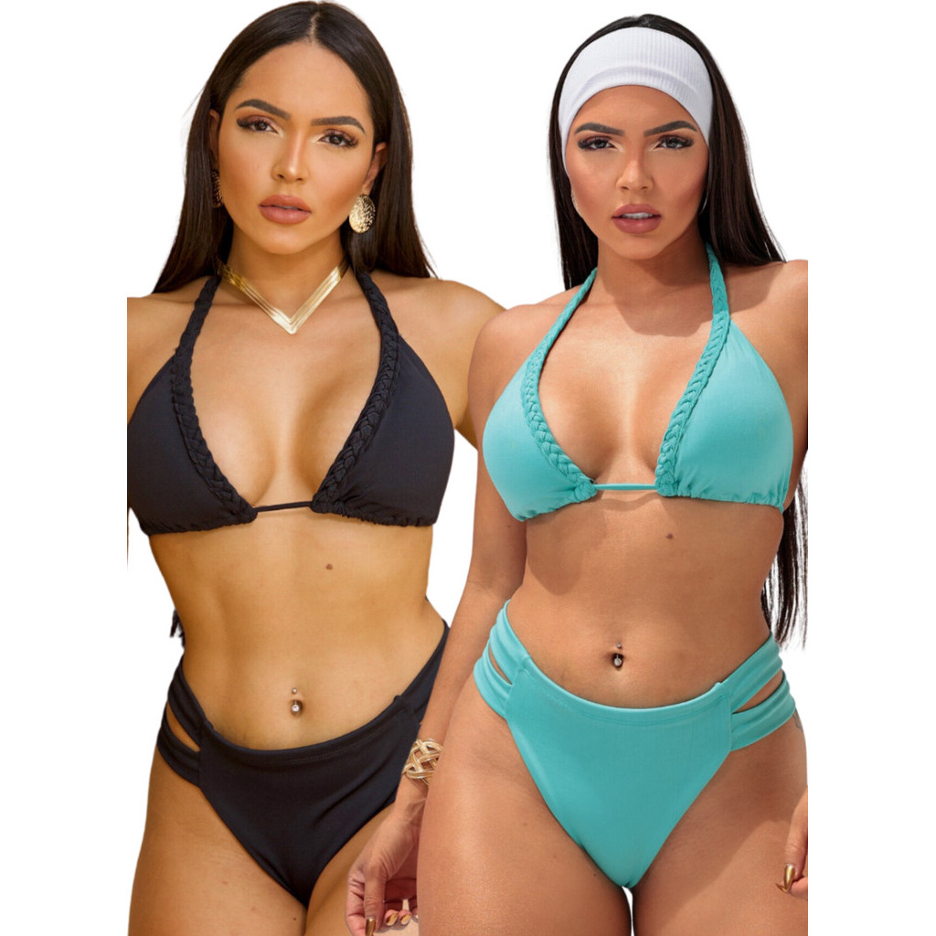Kit 2 Biquinis Cintura Alta Hotpant Cortininha C Trança Bojo