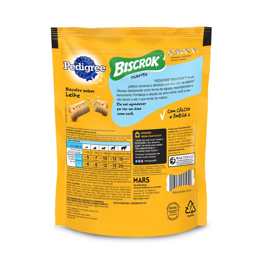 Biscoito Pedigree Biscrok Cães Filhotes O Biscoito Pedigree Biscrok Cães Filhotes é uma excelente opção para você que busca oferecer o melhor para o seu filhotinho de cachorro, em todos os momentos do dia!Elaborado com elementos selecionados, o petisco tem 5 cereais na formulação que ajudam a promover uma boa digestão e a formação de fezes mais firmes e fáceis de limpar. Além disso, a quantidade redobrada de cálcio na composição garante uma boa formação para os dentes e os ossos do cachorro, que serão fundamentais quando ele for adulto e idoso.O Pedigree Biscrok Cães Filhotes ajuda a manter as gengivas saudáveis e previne a formação de tártaro, e tem ossinhos com tamanho adequado ao maxilar dos filhotes.Você vai ver na beleza dos pelos do seu filhote os efeitos do ômega 6 na composição do petisco para Filhotes. Isso tudo com muito sabor e crocância, que seu filhotinho vai adorar!