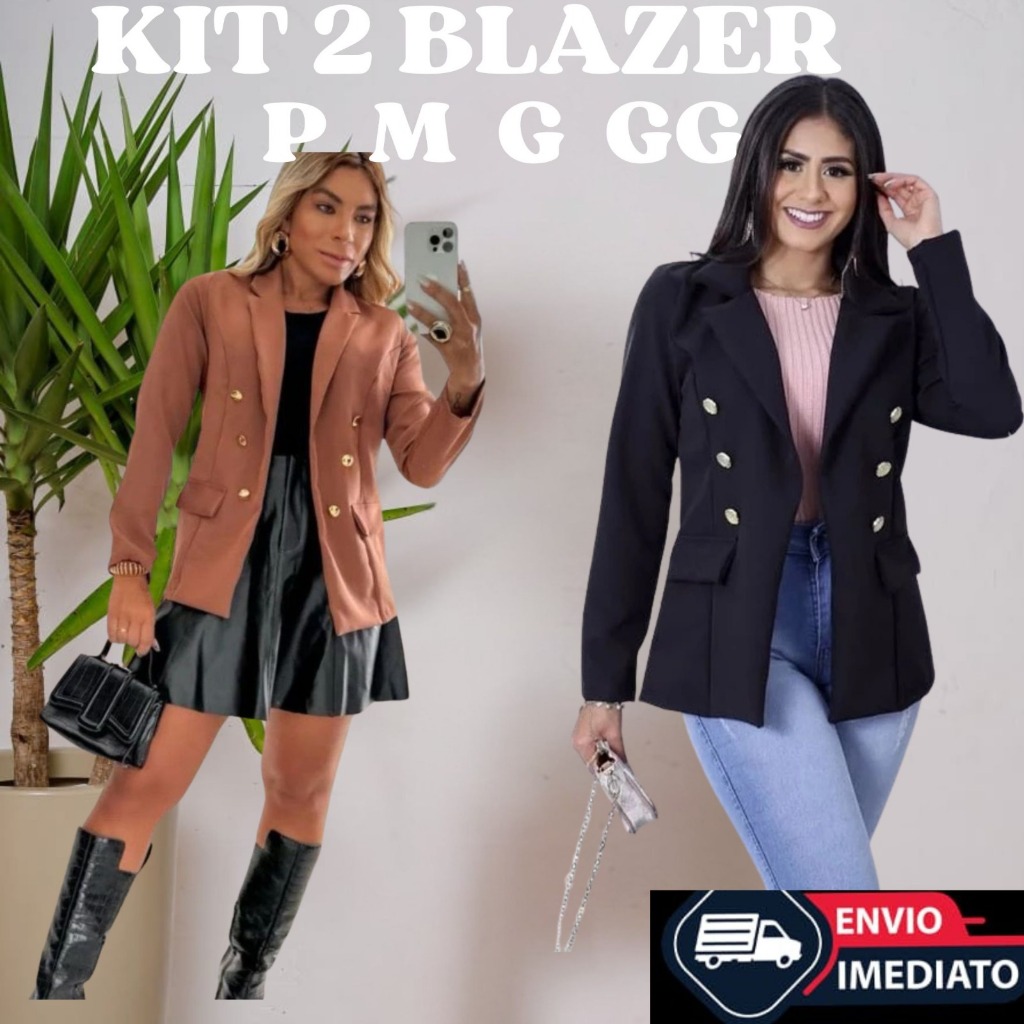 Kit 2 Blazer alfaiataria feminino Max/csaco, blezer com botoes, acinturado! Tecido: Alfaiataria Sem forrado com 6 botões Modelo veste exatamente a peça que vendemos. Tamanhos: P: veste 36/38 M: veste 38/40 G: veste 42. GG veste 44 Medidas Tamanho P: Busto (86cm) Comprimento (65cm) Manga (59cm) Tamanho M: Busto (90cm) Comprimento (66cm) Manga (60cm) Tamanho G: Busto (94cm) Comprimento (67cm) Manga (61cm) Tamanho GG: Busto (98cm) Comprimento (68cm) Manga (62cm)