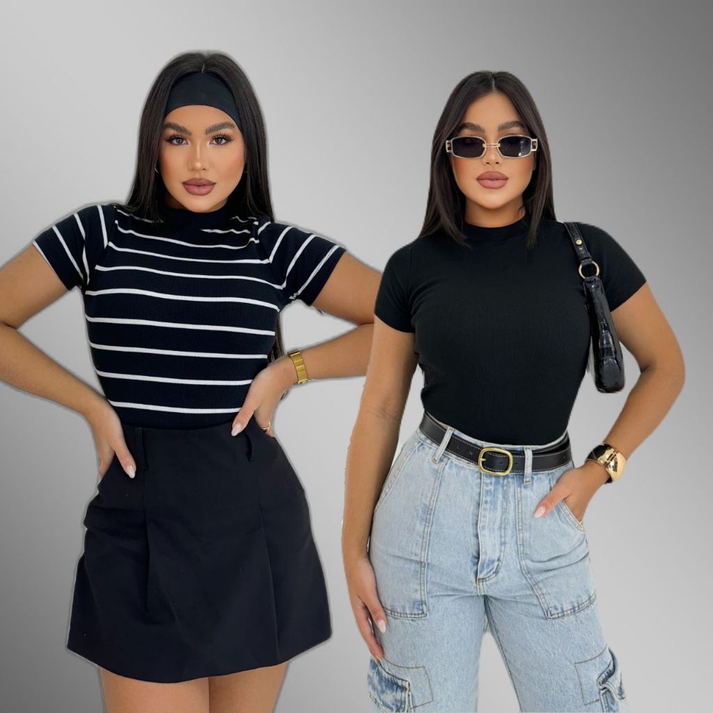 KIT 2 Blusa Básica Listrada e Lisa Ribana Canelado Premium Casual Moda Basico Camiseta T-Shirt