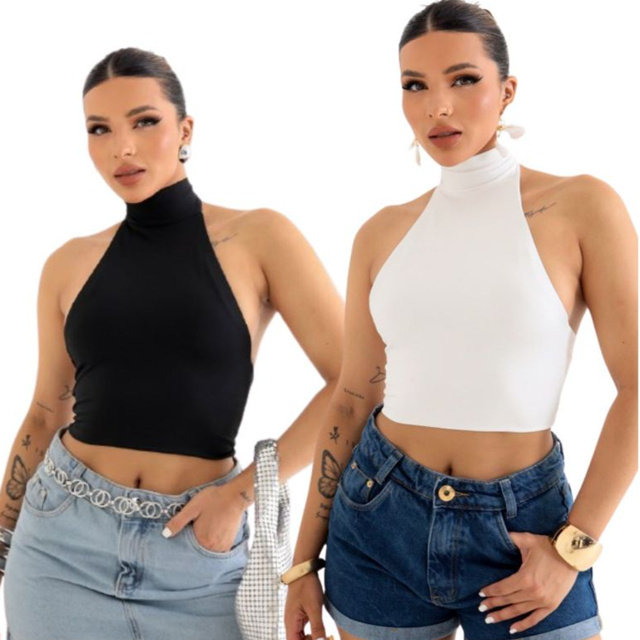 KIT 2 Blusa Feminina Cropped Costa Nua Frente Única Gola Alta Amarração Suplex