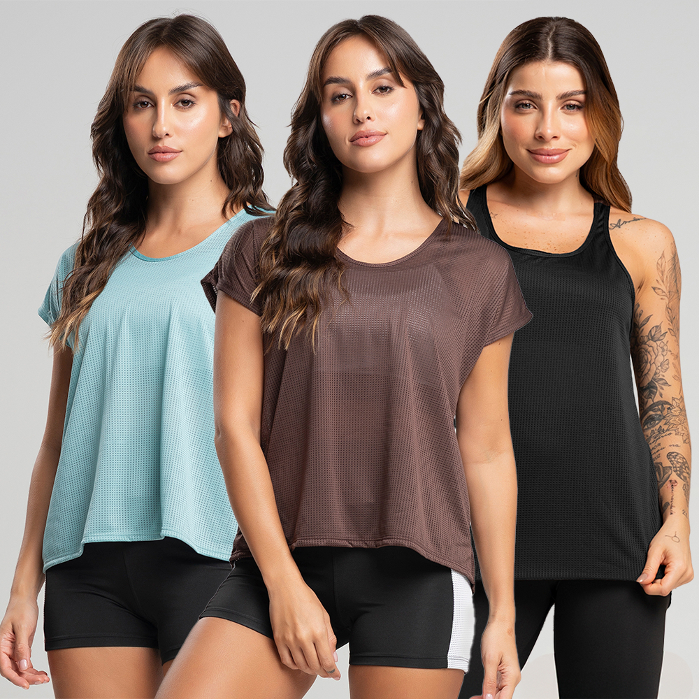 Kit 2 blusas dry fitness musculação + 1 regata dry esportivo fio sem costura academia