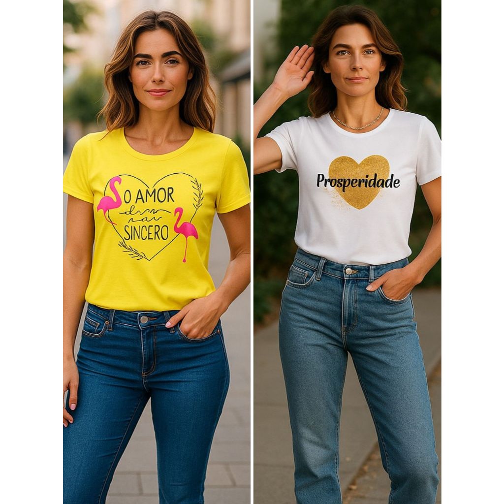 Kit 2 blusas femininas estampa amor sincero e prosperidade