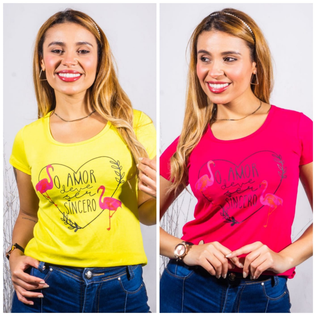 Kit 2 Blusas Femininas Estampa Flamingo Manga Curta