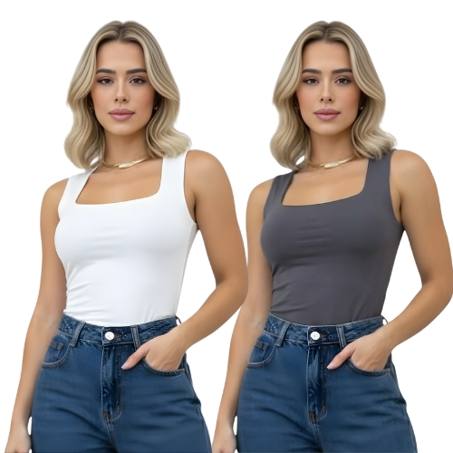 Kit 2 Blusinha Regata Decote Quadrado Reto Na Frente Suplex Tendência Blogueira Fashion Minimalista