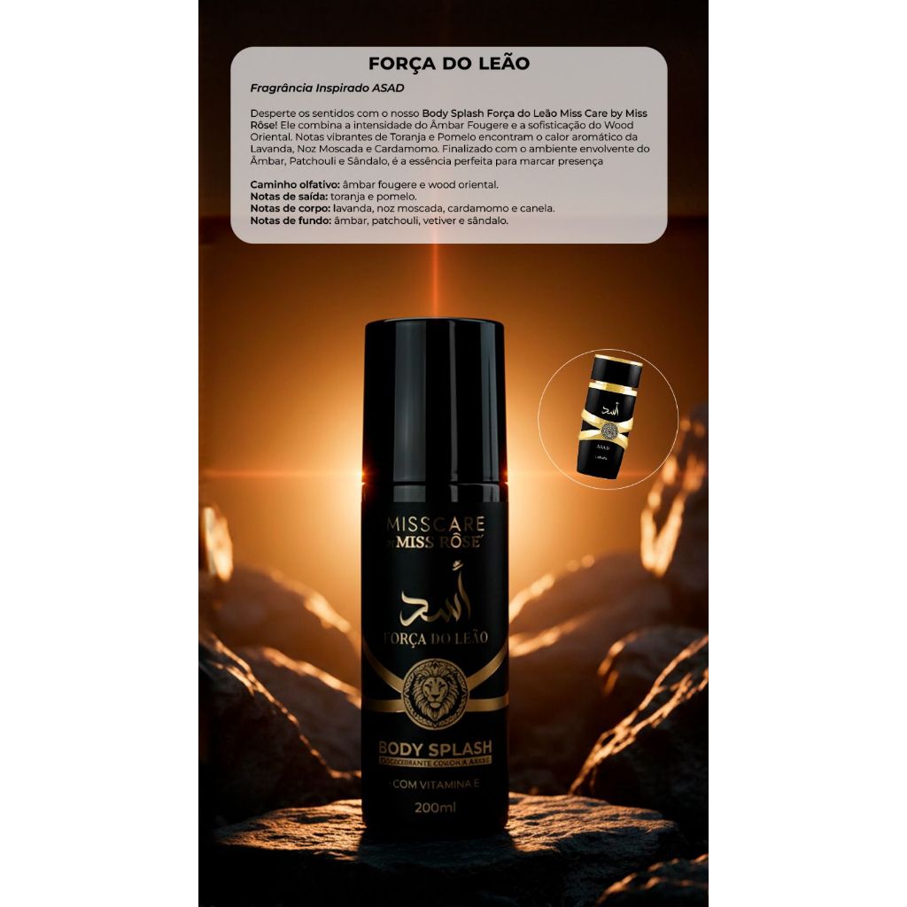 O Kit com 2 Body Splash Masculinos Miss Rose é ideal para homens que gostam de fragrâncias marcantes, refrescantes e com toque sofisticado. Inspirados no estilo árabe, oferecem perfumação agradável para o dia a dia. CONTEÚDO DO KIT 2 Body Splash Miss Rose Masculino 200ml cada unidade BENEFÍCIOS ✔ Fragrância masculina intensa e envolvente ✔ Sensação de frescor prolongada ✔ Ideal para uso diário ✔ Pode ser reaplicado ao longo do dia ✔ Excelente opção para presente FRAGRÂNCIAS Masculinas conforme disponibilidade. Caso queira escolher a fragrância, fale conosco pelo chat após a compra. MODO DE USO Aplicar diretamente sobre a pele limpa sempre que desejar. INFORMAÇÕES DO PRODUTO Marca: Miss Rose Categoria: Body Splash Conteúdo: 200ml cada Produto novo e original Uso externo