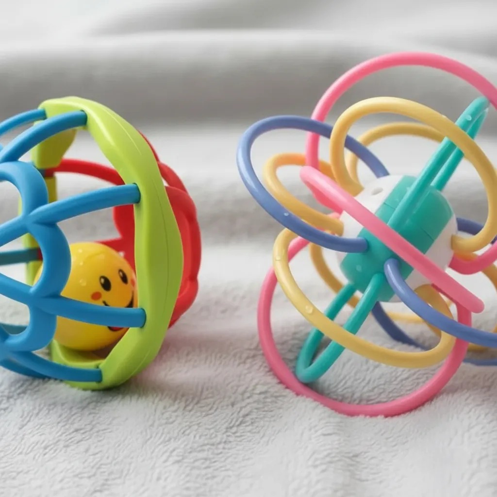 Kit 2 Bolinhas Chocalho Mordedor Silicone Infantil Brinquedo Para Bebes Dentição Ocupações Sensorial