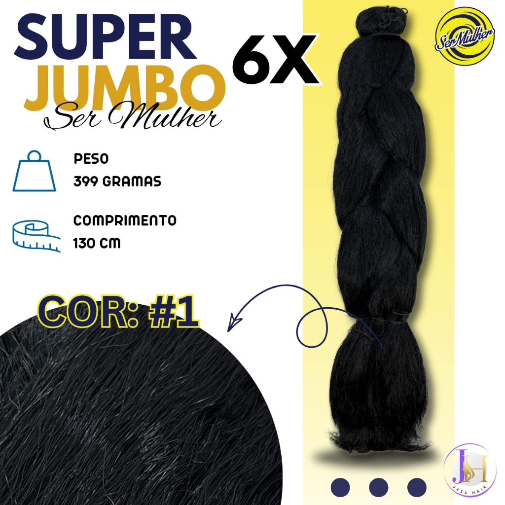 CABELO JUMBO KIT COM 2 PACOTES + ANÉIS MARCA: SER MULHER PESO: 399 GRAMAS COMPRIMENTO: 65cm DOBRADO - 130cm ABERTO MATERIAL: FIBRA SINTÉTICA 100% POLIPROPILENO Super Jumbo Braid é uma fibra sintética, indicada para aplicação no método box braids mas com sua versatilidade e qualidade oferecer inúmeras outras opções de aplicações. Ideal para tranças soltas, enraizadas, crochet braids, twist, box braids, alongamento entrelaçado e outros métodos de penteados. Leve, textura macia e com pouco brilho; Fibra resistente a temperaturas até 180º C