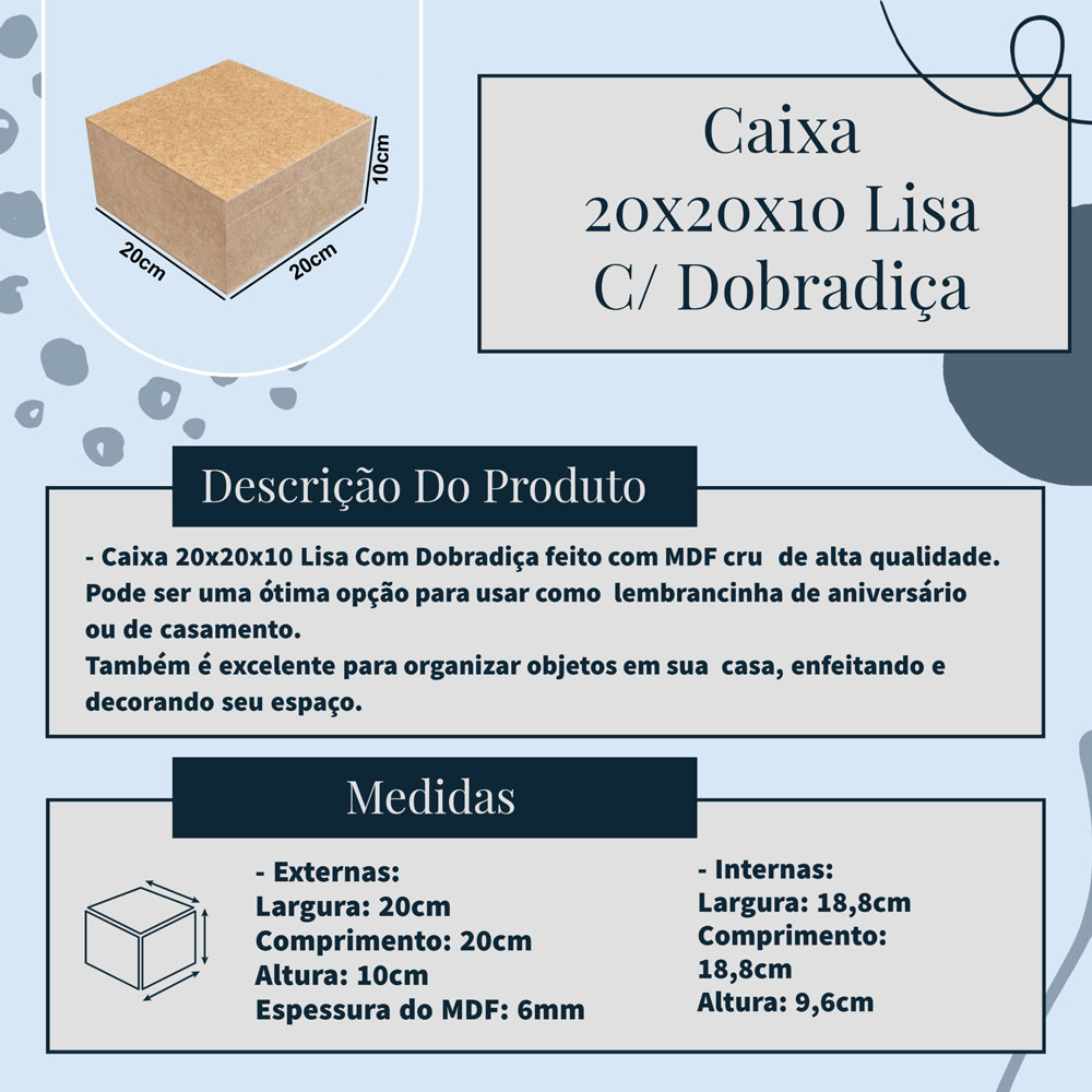 | Kit 2 Caixa Lembrancinha 20x20x10 Lisa Com Dobradiça - MDF este produto | R$ 35,90 | — | 5.0/5 | — |
