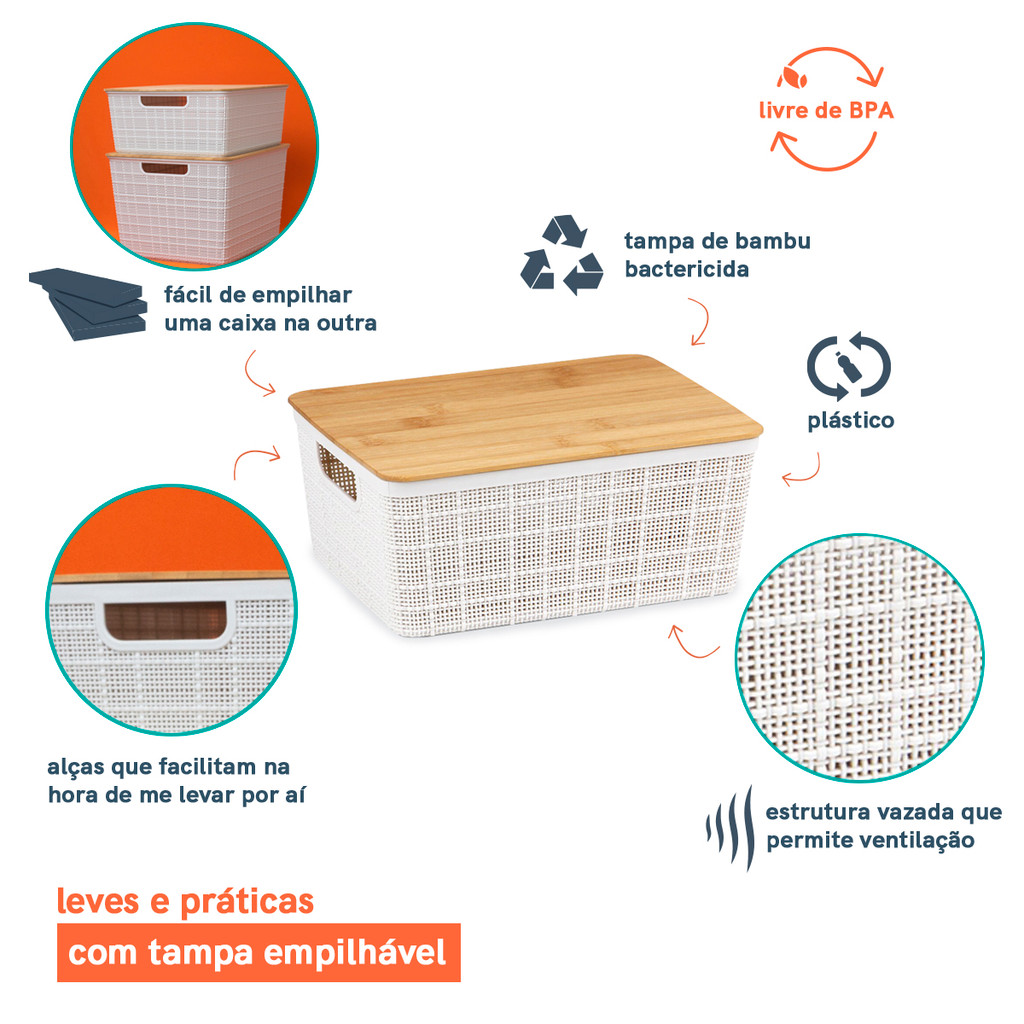 | Kit 2 Caixas Organizadoras 12 Litros Branca C/ Tampa Bambu este produto | R$ 152,90 | 27% | 5.0/5 | 11 |