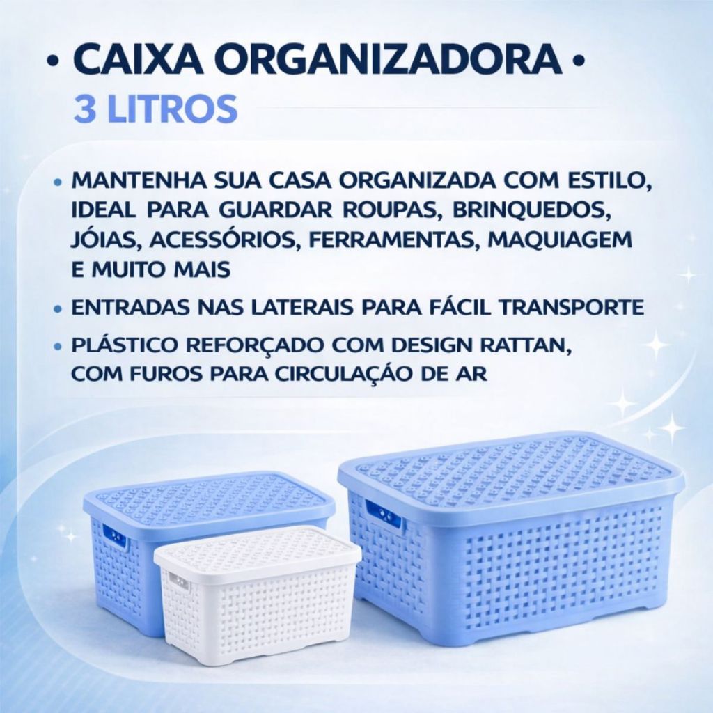 Caixa Organizadora Rattan - 3 Litros Mantenha sua casa organizada com estilo! Nossa caixa organizadora Rattan é perfeita para guardar roupas, brinquedos, joias, ferramentas, maquiagens e muito mais. Características: - Material: Plástico reforçado com design Rattan - Tamanho: 10 cm x 17 cm x 22 cm (3 litros) - Tampa e entradas laterais para fácil transporte - Furos para circulação de ar - Fácil de limpar Entrega: - Prazo de envio: até 24h (dias úteis) - Embalagem cuidadosa para evitar danos Atendimento: - Resposta rápida a dúvidas - Produtos novos e prontos para entrega Compre agora e mantenha sua casa organizada com estilo!