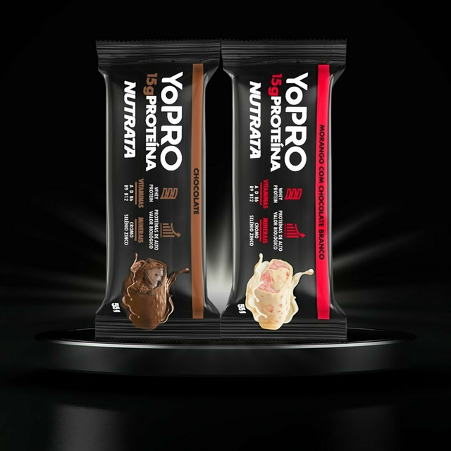 ------------------------- Nutrata YOPRO ------------------------- Snacks proteicos e a experiência da Danone no segmento, o mercado nacional recebe mais uma opção inovadora: UMA BARRA DE PROTEÍNA DELICIOSA, NUTRITIVA E PRÁTICA. ------------------ Benefícios ------------------ - 15g de proteína; - Vitaminas A, D, B6, B9, B12; - Minerais Cromo, Selênio e Zinco; - Blend de proteína de alto valor biológico. Sugestão e Indicação de Uso: Consumir uma unidade ao dia. ------------------------- INGREDIENTES ------------------------- Blend proteico (caseinato de cálcio, proteína concentrada de leite, proteína de soro do leite concentrada, proteína de soro do leite isolada e colágeno hidrolisado), cobertura de chocolate branco, recheio cremoso sabor chocolate branco, óleo de palma (Elaeis guineenses), iogurte natural integral em pó, polidextrose, crispies sabor morango, vitaminas (acetato de retinol, colecalciferol, cloridrato de piridoxina, ácido fólico e cianocobalamina), minerais (sulfato de zinco, selenito de sódio e picolinato de cromo), aromatizantes, cloreto de sódio, edulcorantes sorbitol e sucralose, umectante glicerol, antiumectante fosfato tricálcico, emulsificantes goma acácia e lecitina de girassol, conservantes sorbato de potássio e benzoato de sódio, antioxidante Dl-alfa-tocoferol e corantes vermelho allura AC e carmins. CONTÉM LACTOSE. ALÉRGICOS: CONTÉM AMENDOIM E DERIVADOS DE LEITE E DE SOJA. PODE CONTER AVELÃ. NÃO CONTÉM GLÚTEN.