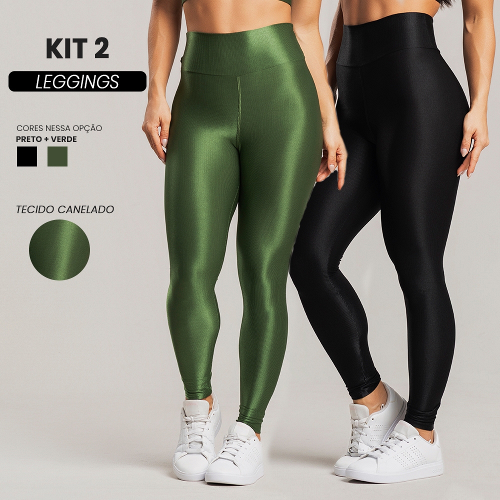 Kit 2 Calça legging fitness feminina canelada cintura alta com brilho para treino