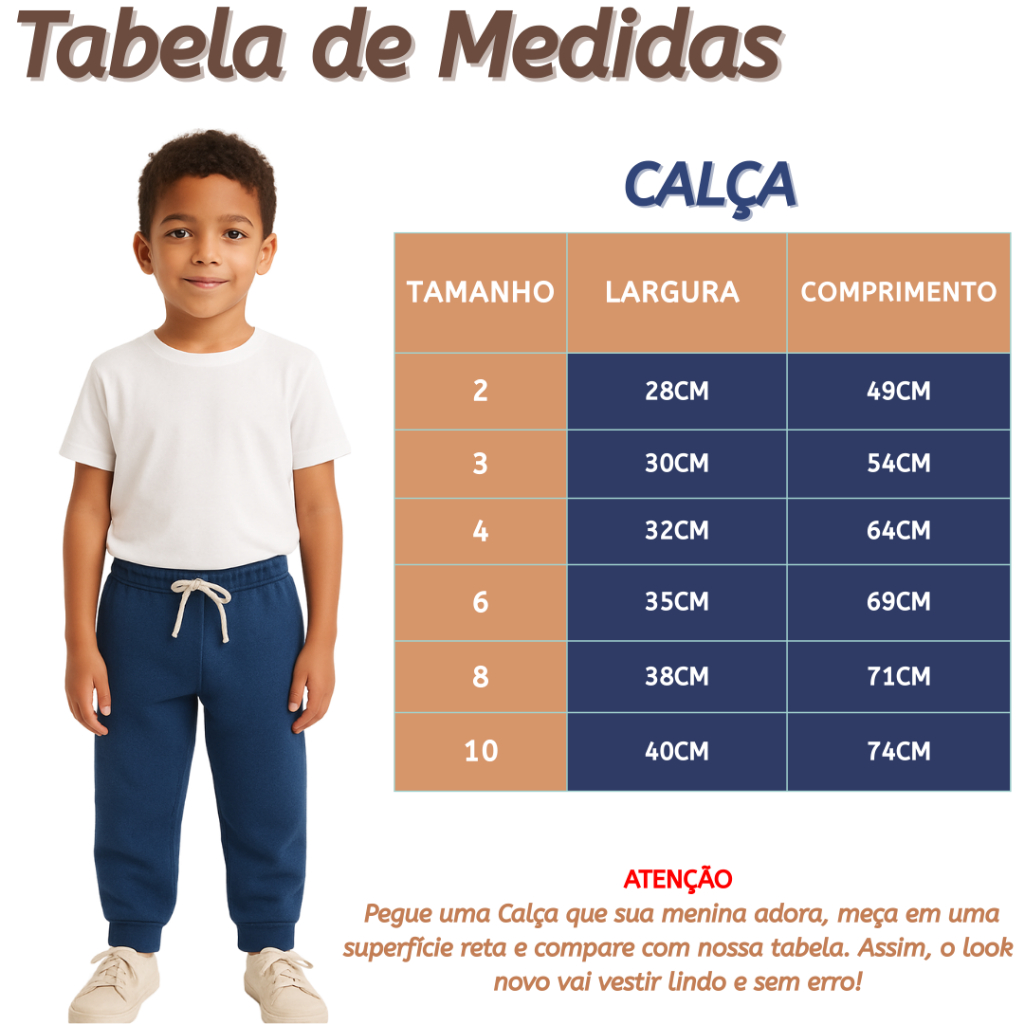 Kit 2 Calças de Moletom Peluciadas – Tamanhos 2 ao 10 Deixe os pequenos confortáveis, estilosos e quentinhos com nosso kit com 2 calças de moletom peluciadas, ideal para o dia a dia, escola, passeios ou momentos de diversão em casa. Características do Produto: Modelagem confortável com elástico na cintura e cordão ajustável. Tecido de moletom peluciado por dentro, super macio e quentinho. Punhos canelados na barra para melhor ajuste e proteção nos dias frios. Ideal para meninos Cores: Azul Marinho e Preto. Kit acompanha 2 calças, conforme imagem. ⚠️ Dica Importante para Escolher o Tamanho Ideal: Pegue uma calça que seu filho(a) já usa e gosta, meça em uma superfície reta e compare com a tabela acima. Isso evita trocas e garante que o look novo vista perfeitamente! Cuidados com a Peça: Lavar à mão ou na máquina em ciclo delicado. Não usar alvejante. Passar em temperatura baixa. Secar à sombra. 📏 Tabela de Medidas – Calça Infantil: Tamanho 2: Largura 28 cm | Comprimento da perna 49 cm Tamanho 3: Largura 30 cm | Comprimento da perna 54 cm Tamanho 4: Largura 32 cm | Comprimento da perna 54 cm Tamanho 6: Largura 35 cm | Comprimento da perna 69 cm Tamanho 8: Largura 38 cm | Comprimento da perna 71 cm Tamanho 10: Largura 40 cm | Comprimento da perna 74 cm Qualquer Duvida entre em Contato com a nossa Loja