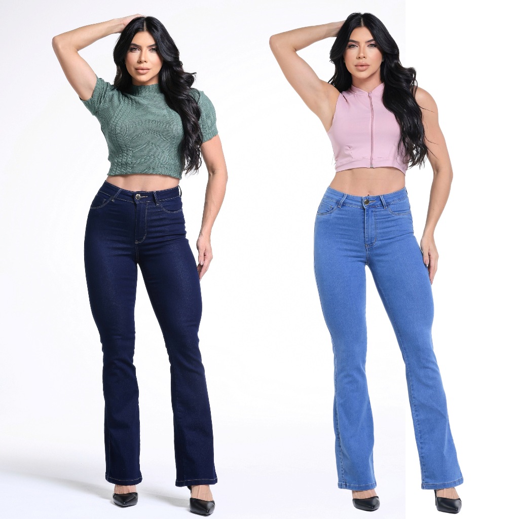 Kit 2 Calças Flare Jeans Feminina Cos Alto Com Elastano Cintura Alta Boca de Sino