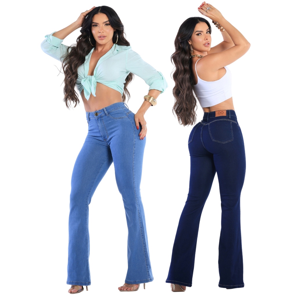Kit 2 Calças Jeans Feminina Flare Levanta Bumbum Cos Alto Com Lycra Boca De Sino