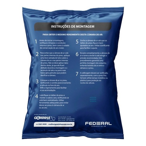 Kit 2 Câmaras De Ar Federal Xre190 Bros Aro 17 Traseiro M0617 Sobre a marca: Líder da América Latina, a Tortuga, fabricante da Câmara Federal, é uma empresa nacional especializada na fabricação de câmaras de ar a mais de 60 anos. Possui um moderno centro industrial no Paraná, contando com duas fábricas, em Araucária e Curitiba, que o tornaram a fornecedora oficial de câmaras de ar dos maiores fabricantes de pneus e equipamentos originais das principais montadoras de máquinas e implementos agrícolas do Brasil, contanto com a Certificação ISO 9001, uma referência internacional de qualidade. Sobre a câmara Federal: As câmaras de ar Federal (By Tortuga), são desenvolvidas com matéria prima de alta qualidade, fabricado por especialistas, caracterizado por mais borracha, maior resistência, mais durabilidade uma alta resistência ao calor. Além disso, conta com o selo de certificação ISO 9001, uma referência internacional em qualidade, um diferencial da empresa. Informações Adicionais: - Medida: M 0617 - Modelo de válvula: TR 4 Aplicação: - Yamaha: Crosser 150, XTZ 150 Crosser, XT 660, XT 660Z Ténéré, XT600, Fazer 250 - Honda: NXR 125 Bros Todas, NXR 150 Bros, NXR 160 Bros, XRE 190 - Traxx: Fly 150, Fly 250 - Shineray: Explorer 150, Discover 250 O que você vai receber? - 2 UNIDADES da Câmara Federal M0617 TR4 “POR FAVOR, VERIFIQUE SEMPRE NO VEÍCULO QUAL É A MEDIDA EXATA DO SEU ARO” Garantia de 3 anos contra defeito de fabricação.