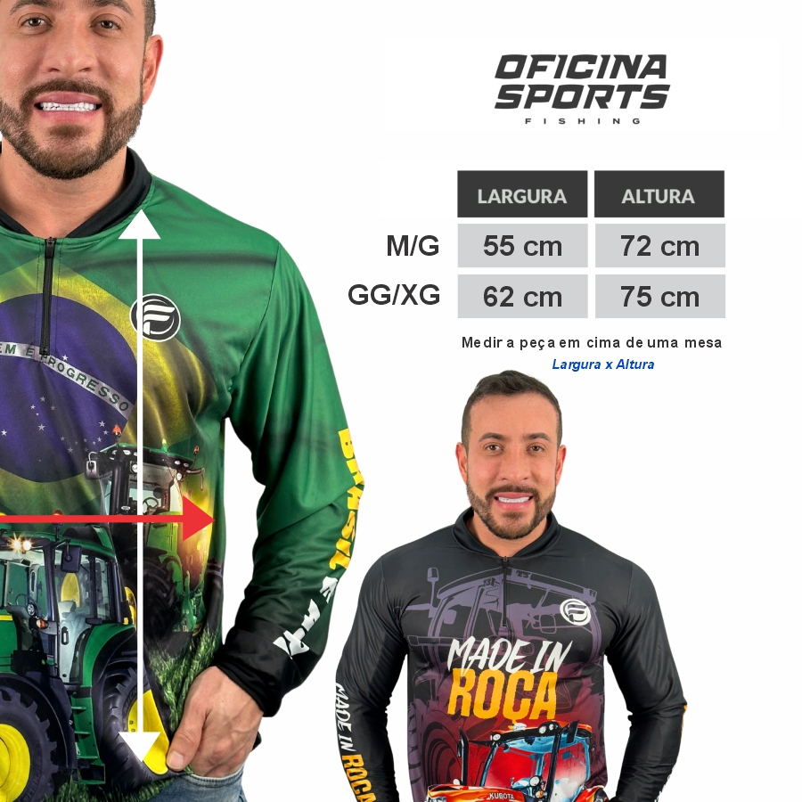 KIT 2 CAMISA DE AGRO DRYFIT COM ZÍPER – UV50+ PREMIUM + 1 BANDANA PRETA Camisa ideal para quem busca conforto, proteção solar e alta durabilidade em pescarias e atividades ao ar livre. Desenvolvida com tecido Dryfit Ultra Premium UV50+, garante excelente respirabilidade e proteção mesmo sob sol forte. 📸 Modelo da foto Altura: 1,72 m | Peso: 80 kg | Tamanho: M/G 🔥 DIFERENCIAIS DO PRODUTO ✔ Proteção solar UV50+ comprovada ✔ Zíper frontal emborrachado com trava de segurança ✔ Estampa 3D em alta definição ✔ Tecido leve, respirável e secagem super rápida ✔ Confrto térmico em dias quentes ou frios ✔ Não amassa e não desbota ✔ Gola anatômica com ótimo caimento ✔ Modelagem confortável ✔ Acabamento premium 📌 ESPECIFICAÇÕES Tecido: Dryfit Ultra Premium Composição: 100% Poliéster Modelo: Unissex 📏 MEDIDAS (LARGURA x ALTURA) M/G: 56 x 74 cm GG/XG: 62 x 76 cm ⚠ As medidas podem variar até 3% 📐 COMO ESCOLHER O TAMANHO IDEAL 1️⃣ Meça uma camisa sua em superfície plana 2️⃣ Compare largura e comprimento com a tabela 3️⃣ Escolha o tamanho que mais combina com você