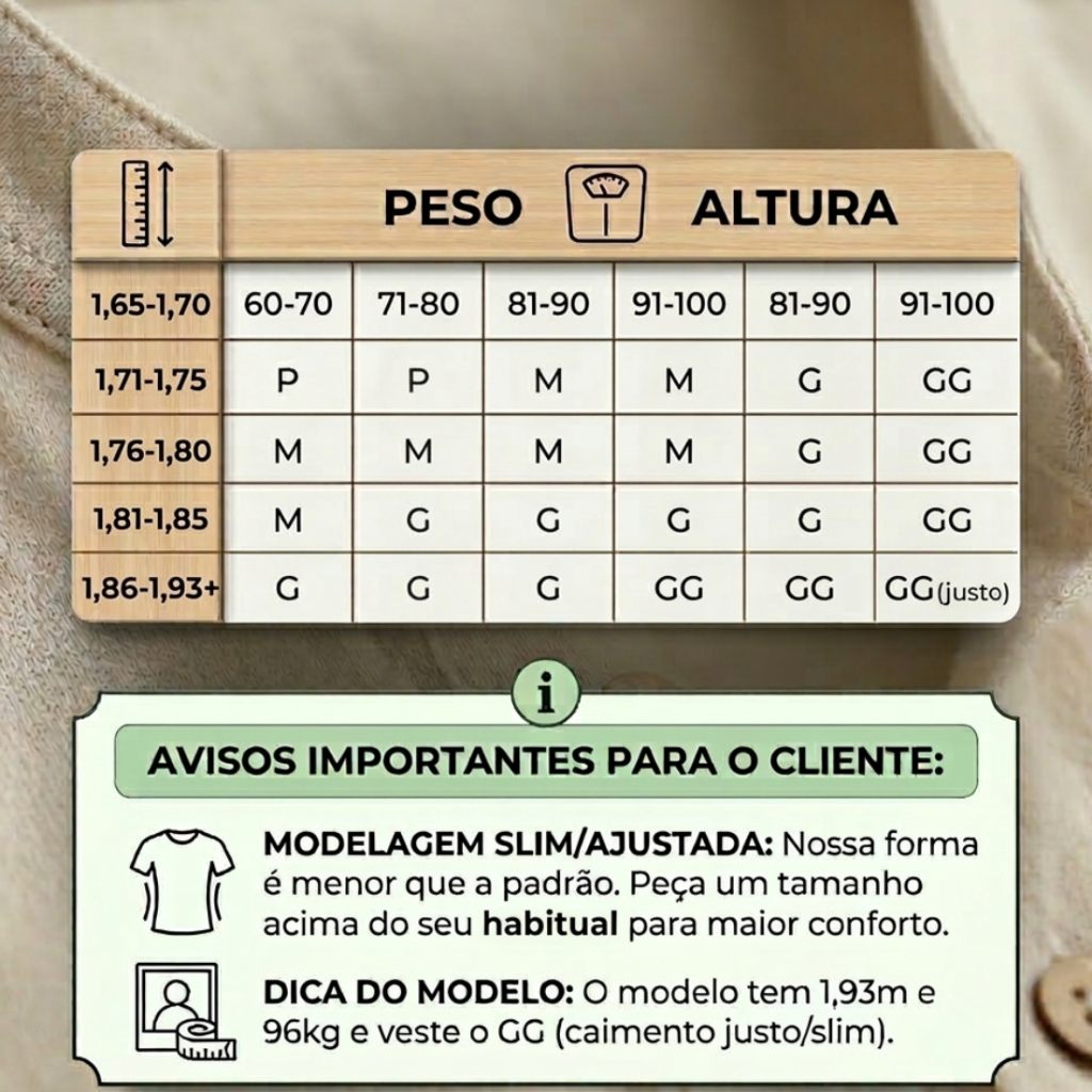 📏 Modelagem com forma menor. Para mais conforto, recomendamos comprar 1 tamanho acima do que você normalmente usa. 😎 Camisa Social Gola Padre Manga Curta — elegante, prática e perfeita pro verão. ⚡️ Secagem rápida e toque fresco: ideal pro dia a dia, trabalho ou rolê com os amigos. 🎨 Cores disponíveis: Preto, Branco, Bege, Azul Marinho, Caqui. ✨ Modelagem social com gola padre e manga curta pra um look moderno e fácil de combinar. 💬 Dica: a peça fica ótima com jeans e sneakers, ou com casacos leves pra noite. Tabela de Medidas "em centímetros" P - Comprimento: 67 - Tórax: 50 - Manga: 17 - Ombro a Ombro: 41 M - Comprimento: 67 - Tórax: 55 - Manga: 17 - Ombro a Ombro: 45 G - Comprimento: 69 - Tórax: 56 - Manga: 19 - Ombro a Ombro: 47 GG - Comprimento: 74 - Tórax: 59 - Manga: 20 - Ombro a Ombro: 49