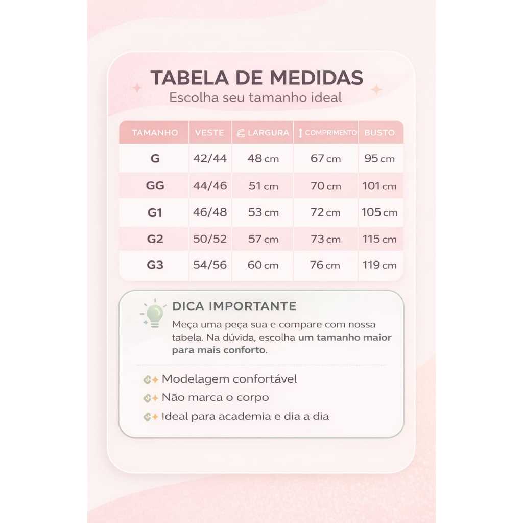 2 Blusas Casual Tapa Bumbum, uma peça essencial para o guarda-roupa, pensada para oferecer conforto, praticidade e versatilidade. Com comprimento alongado que cobre o bumbum, ela é ideal tanto para a prática de atividades físicas quanto para o uso no dia a dia. Confeccionada em Viscolycra, um tecido macio, leve e com excelente elasticidade, que acompanha seus movimentos sem apertar ou marcar. ⚠️ ATENÇÃO: Produto com acabamento em corte a fio (sem barra), trazendo um visual moderno e minimalista. 📌 CARACTERÍSTICAS DO PRODUTO Quantidade: 2 unidade Modelagem: Alongada / Tapa Bumbum Uso: Casual e Fitness Acabamento: Corte a fio (sem barra) Tecido: Malha de Viscose com Elastano Composição: 96% Viscose | 4% Elastano 📏TABELA DE MEDIDAS Tamanho Veste Aproximadamente G Nº 42 / 44 Largura: 48CM Comprimento: 67CM Busto: 95CM GG Nº 44 / 46 Largura: 51CM Comprimento: 70CM Busto: 101CM G1 Nº 46 / 48 Largura: 53CM Comprimento: 72CM Busto: 105CM G2 Nº 50 / 52 Largura: 57CM Comprimento: 73CM Busto: 115CM G3 Nº 54 / 56 Largura: 60CM Comprimento: 76CM Busto: 119CM 📌 Dica: Meça uma peça que você já usa e compare com as nossas medidas para escolher o tamanho ideal. Em caso de dúvida, escolha o tamanho maior para um caimento mais confortável. Compre agora e sinta-se confiante e estilosa! Todas as peças tem o corte a fio ou seja o acabamento é liso, sem costuras na gola, mangas e barra da camisa.