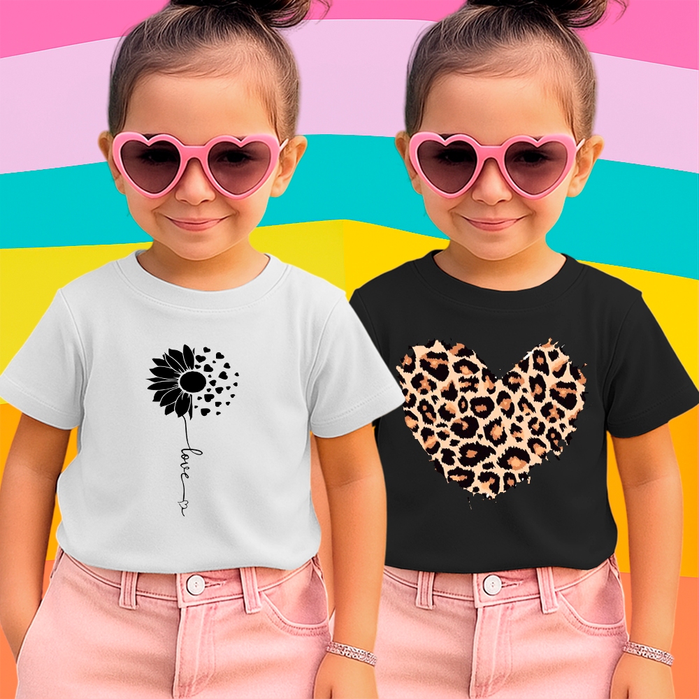 Kit 2 Camisetas Flor Love e Coração Onça Infantil Menina Criança Manga Curta 100% Algodão 30.1