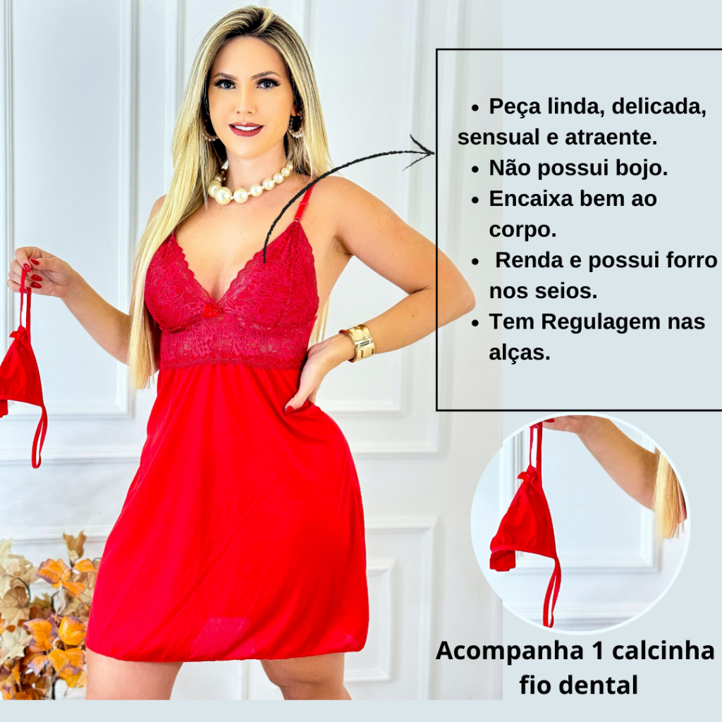 Bem-vinda (o) à KR Style 📦Produtos à pronta entrega, envio realizado em menos de 10 horas úteis; ✅ A Camisola foi desenvolvida para deixar a mulher ainda mais bonita e atraente. Peça linda e com o tecido leve e fresquinho se ajusta perfeitamente ao corpo. A grande vantagem é não precisar passar. Além disso, não importa quantas vezes você lave, ela não desbota e nem solta bolinhas, seca bem rapidinho. Perfeita para quem gosta de beleza e conforto. ⚠️ATENÇÃO: Para comprar mais de 1 kit com cor diferente, selecione a cor desejada e o tamanho de uma por uma e vai adicionando ao carrinho e, só então, finalize a compra. Devido ao nosso processo automatizado de separação, não será possível alterar o tamanho ou cor após a compra ser realizada (nem mesmo através do chat). ✅ Medidas Aproximadas. P - 34/36 - Busto 73-78, Costas 58-64, Cintura 55-61, Quadril 79-86. M - 38 - Busto 79-86, Costas 65-72, Cintura 62-69, Quadril 87-94. G - 40 - Busto 87-92, Costas 73-82, Cintura 70-77, Quadril 92-102. GG - 42/44 -Busto 93-98, Costas 83-91, Cintura 78-85, Quadril 103-110. ✅QUAL O DIFERENCIAL DESSA CAMISOLA? » Tecido - 97% Poliéster | 3% Elastano » Renda - 90% Poliamida | 10% Elastano » Alça regulável. » Acompanha calcinha fio dental. » Não amarrota, não precisa passar. » Secagem rápida após a lavagem. » Veste super bem, valorizando o desenho do seu corpo. » Cores Vivas e Vibrantes. » Não desbota e não solta bolinha. ✅ DIFERENCIAIS DA NOSSA EMPRESA: » Atendimento Premium: Aqui você é prioridade. » Enviamos todo dia ás 15:00hrs. Se comprar antes disso, enviamos seu pedido no mesmo dia. » Mais de 15 anos de mercado. » Produto 100% nacional, a compra é feita direto da fábrica. DÚVIDA FREQUENTE: 1️⃣- Tem os produtos à pronta entrega? Em quanto tempo será enviado? Resposta: Sim, temos todas as peças a pronta entrega para envio imediato. Após efetuar a compra, seu pedido será postado em até 10 horas úteis. ⚠️INSTRUÇÕES DE LAVAGEM E CUIDADOS: Nunca use alvejante com cloro para tirar manchas. Isso desgasta o tecido. Nunca use água em altas temperaturas. Água fria ou morna não agride tanto os fios. Não misture o jeans com peças que possam desbotar ou soltar pelos durante a lavagem, ao lavar a peça não coloque estendida no sol, a camiseta tem a secagem rápida. ⚠️IMPORTANTE: Não usar ferro de passar! Este tecido não amarrota. 🚀 Á PRONTA ENTREGA - ENVIAMOS PARA TODO BRASIL - FOTOS REAIS. - Qualquer dúvida sobre o produto estamos à disposição no chat. -- Boas Compras!! 🛍️