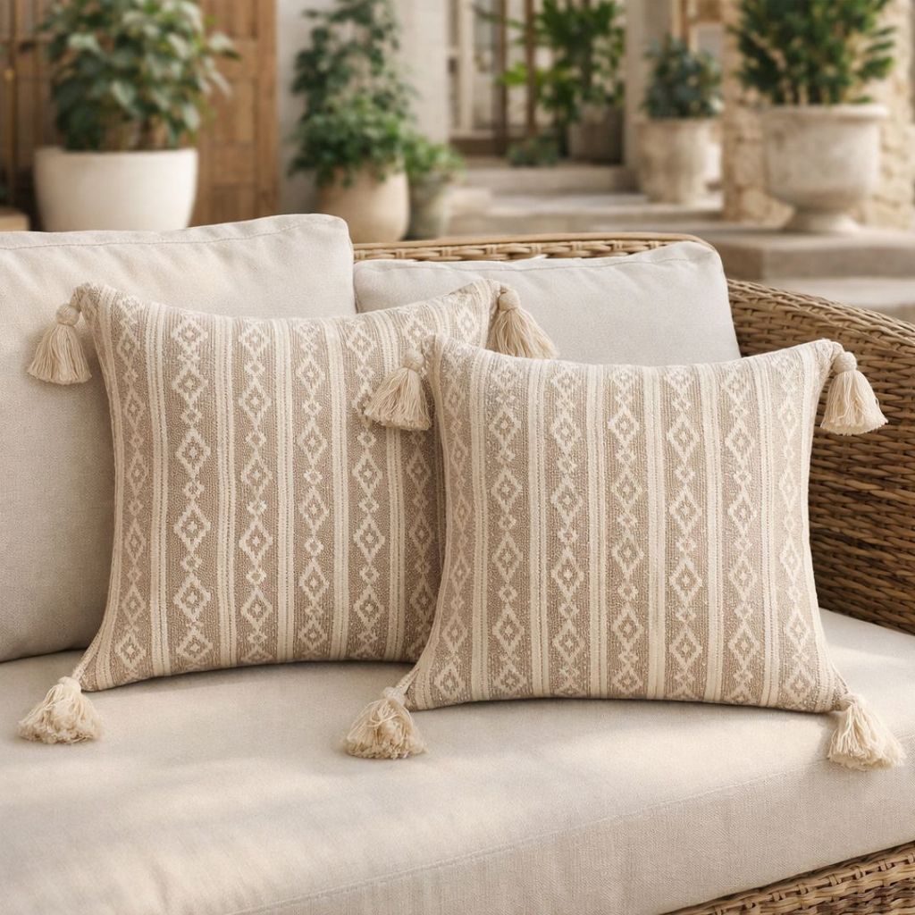 Kit 2 Capas Almofada Decorativa Boho Chic Piquet Cru com Pompom 45x45